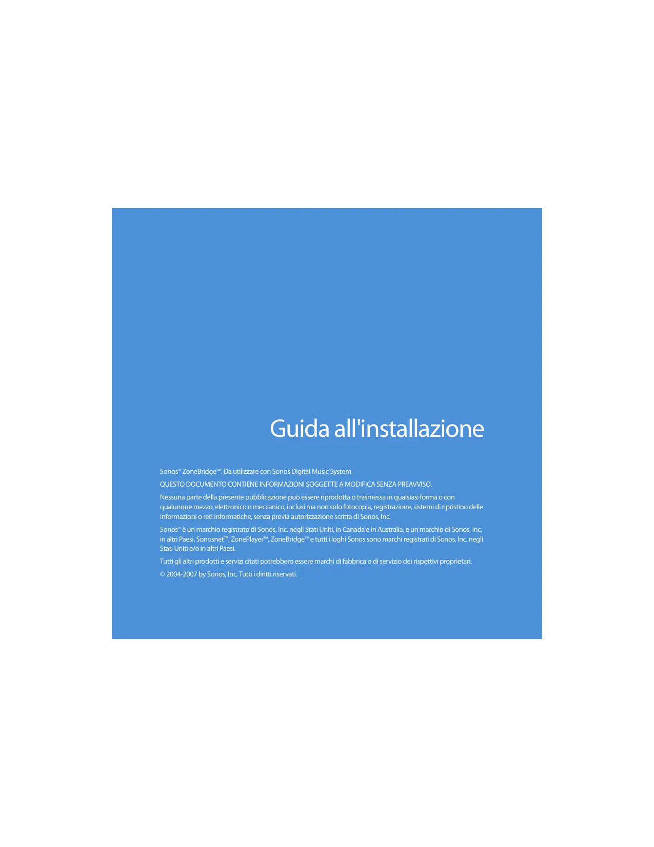 como vasos, encima del aparato. Guida all'installazione Sonos® ZoneBridge™. Da utilizzare con Sonos Digital Music System. QUESTO DOCUMENTO CONTIENE INFORMAZIONI SOGGETTE A MODIFICA SENZA PREAVVISO. Nessuna parte della presente pubblicazione può essere riprodotta o trasmessa in qualsiasi forma o con qualunque mezzo, elettronico o meccanico, inclusi ma non solo fotocopia, registrazione, sistemi di ripristino delle informazioni o reti informatiche, senza previa autorizzazione scritta di Sonos, Inc. Sonos® è un marchio registrato di Sonos, Inc. negli Stati Uniti, in Canada e in Australia, e un marchio di Sonos, Inc. in altri Paesi. Sonosnet™, ZonePlayer™, ZoneBridge™ e tutti i loghi Sonos sono marchi registrati di Sonos, Inc. negli Stati Uniti e/o in altri Paesi. Tutti gli altri prodotti e servizi citati potrebbero essere marchi di fabbrica o di servizio dei rispettivi proprietari. © 2004-2007 by Sonos, Inc. Tutti i diritti riservati.