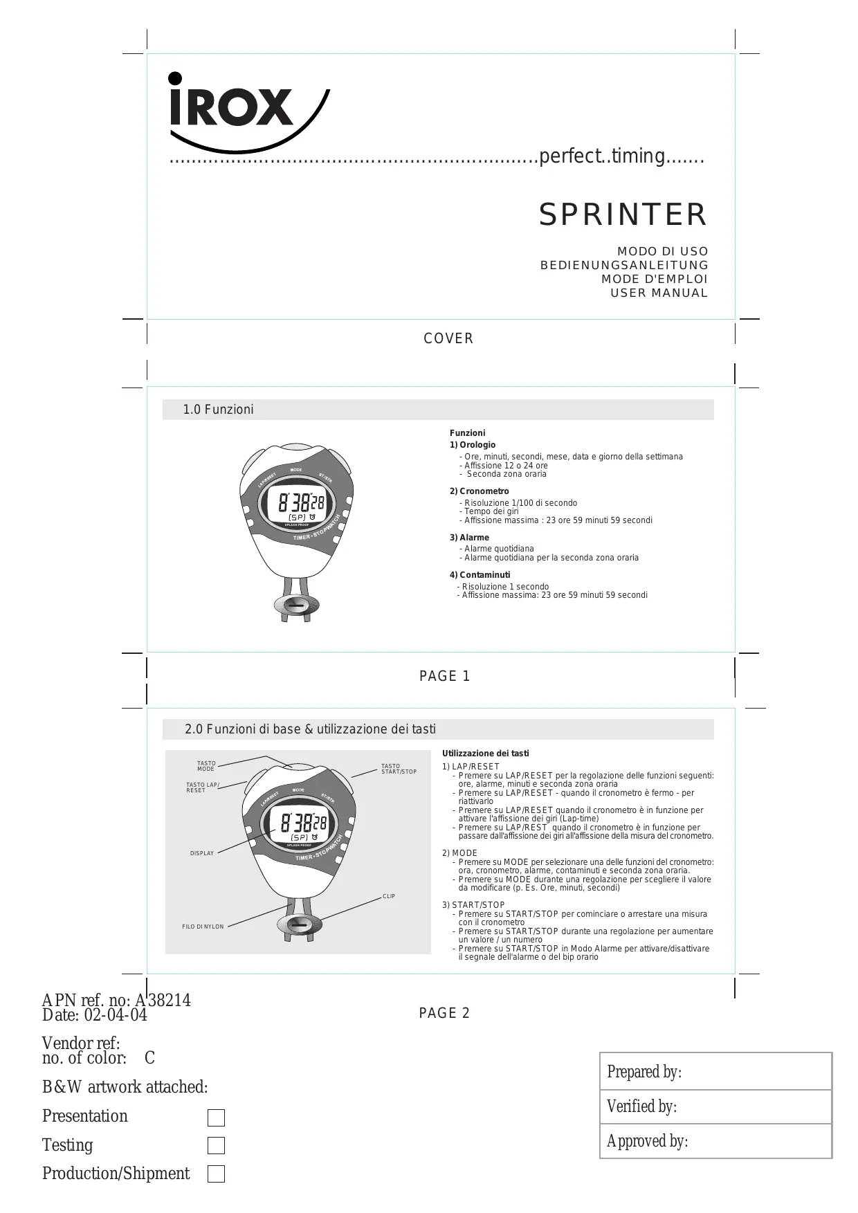 SPRINTER - Cronometro IROX - Manuale utente e istruzioni gratuiti