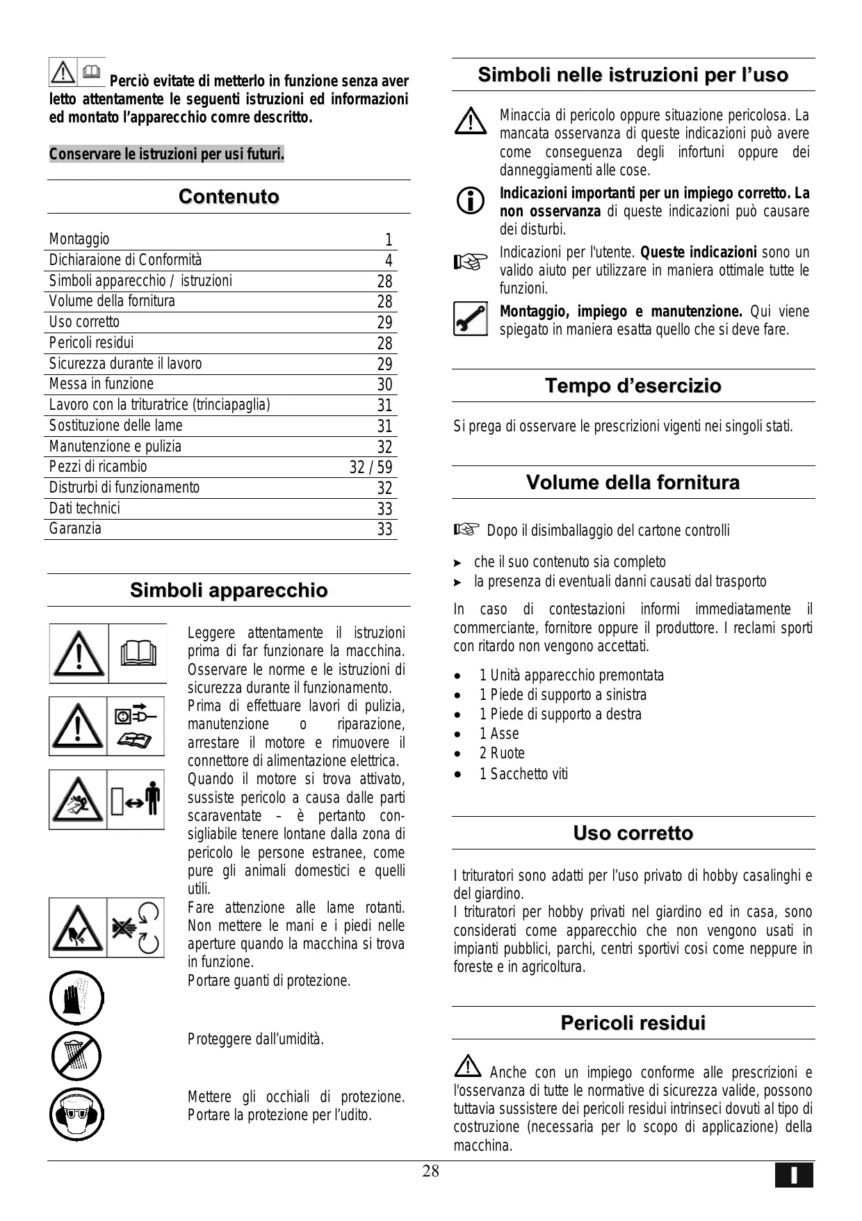 Leggere attentamente il istruzioni prima di far funzionare la macchina. Osservare le norme e le istruzioni di sicurezza durante il funzionamento. Prima di effettuare lavori di pulizia, manutenzione o riparazione, arrestare il motore e rimuovero il connettore di alimentazione elettrica. Quando il motore si trova attivato, sussiste pericolo a causa delle part scaraventate - è pertanto consigliabile tenere lontane alla zona di pericololo le persone estranee, come pure gli animali domestici e quelli utili.