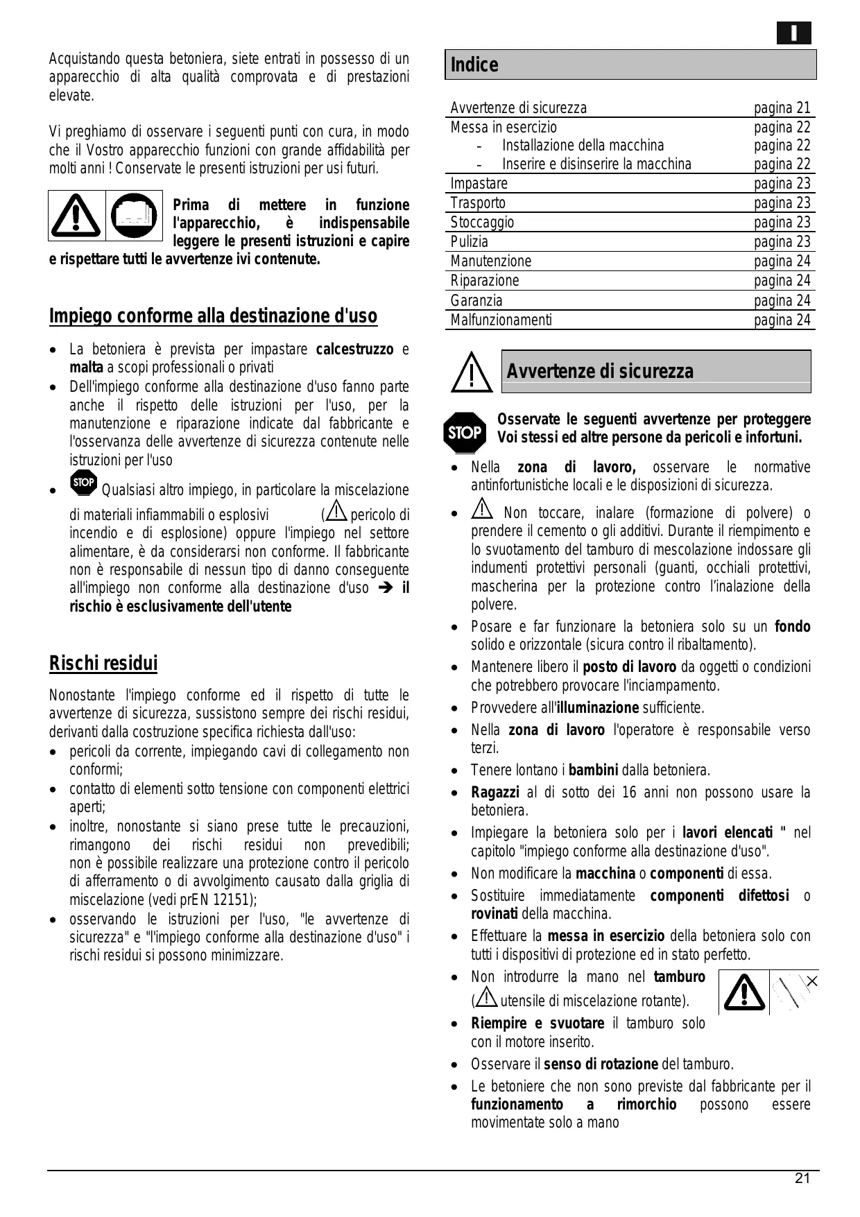 Acquistando questa betoniera, siete entrati in possesso di un apparecchio di alta qualità comprovata e di prestazioni elevate. Vi preghiamo di osservare i seguenti punti con cura, in modo che il Vostro apparecchio funzioni con grande affidabilità per molti anni ! Conservate le presenti istruzioni per usi futuri. Prima di mettere in funzione l'apparecchio, è indispensabile leggere le presenti istruzioni e capire e rispettare tutti le avvertenze ivi contenute. Impiego conforme alla destinazione d'uso + La betoniera è prevista per impastare calcestruzzo e malta a scopi professionali o privati e Dellimpiego conforme alla destinazione d'uso fanno parte anche il rispetto delle istruzioni per l'uso, per la manutenzione e riparazione indicate dal fabbricante e l'osservanza delle avvertenze di sicurezza contenute nelle istruzioni per l'uso . [or] Qualsiasi altro impiego, in particolare la miscelazione di materiali infiammabili o esplosivi (ZA pericolo di incendio e di esplosione) oppure l'impiego nel settore alimentare, à da considerarsi non conforme. || fabbricante non è responsabile di nessun tipo di danno conseguente allimpiego non conforme alla destinazione d'uso => il rischio è esclusivamente dell'utente Rischi residui Nonostante l'impiego conforme ed il rispetto di tutte le awertenze di sicurezza, sussistono sempre dei rischi residui, derivanti dalla costruzione specifica richiesta dall'uso: e_ pericoli da corrente, impiegando cavi di collegamento non conformi; e__contatto di elementi sotto tensione con componenti elettrici aperti; e _inoltre, nonostante si siano prese tutte le precauzioni, rimangono dei rischi residui non prevedibil, non à possibile realizzare una protezione contro il pericolo di afferramento o di avvolgimento causato dalla griglia di miscelazione (vedi pr£N 12151); < osservando le istruzioni per l'uso, ‘le avwvertenze di sicurezza" e “impiego conforme alla destinazione d'uso" i rischi residui si possono minimizzare. Indice Avvertenze di sicurezza pagina 21 Messa in esercizio pagina 22 -__Installazione della macchina pagina 22 -__inserire e disinserire la macchina pagina 22 Impastare pagina 23 Trasporto pagina 23 Stoccaggio pagina 23 Pulizia pagina 23 Manutenzione pagina 24 Riparazione pagina 24 Garanzia pagina 24 Malfunzionamenti pagina 24 /\ Avvertenze di sicurezza © Osservate le seguenti avvertenze per proteggere Voi stessi ed altre persone da pericoli e infortuni. e Nela zona di lavoro, osservare le normative antinfortunistiche locali e le disposizioni di sicurezza... ÂÀ Non toccare, inalare (formazione di polvere) o prendere il cemento o gli additivi. Durante il rrempimento e lo svuotamento del tamburo di mescolazione indossare gli indumenti protettivi personali (guanti, occhiali protettivi, mascherina per la protezione contro l'inalazione della polvere. < Posare e far funzionare la betoniera solo su un fondo solido e orizzontale (sicura contro il ribaltamento). e _ Mantenere libero il posto di lavoro da oggetti o condizioni che potrebbero provocare l'inciampamento. °_ Prowvedere all'illuminazione sufficiente. + Nella zona di lavoro l'operatore à responsabile verso terzi. + Tenere lontano i bambini dalla betoniera. e Ragazzi al di sotto dei 16 anni non possono usare la betoniera. e Impiegare la betoniera solo per i lavori elencati " nel capitolo "impiego conforme alla destinazione d'uso". e_ Non modificare la macchina o componenti di essa. e Sostituire immediatamente componenti difettosi o rovinati della macchina. e Effettuare la messa in esercizio della betoniera solo con tutti i dispositivi di protezione ed in stato perfetto. e Non introdurre la mano nel tamburo VAN utensile di miscelazione rotante). ° Riempire e svuotare il tamburo solo con il motore inserito. e _ Osservare il senso di rotazione del tamburo. e Le betoniere che non sono previste dal fabbricante per il funzionamento a rimorchio possono essere movimentate solo a mano