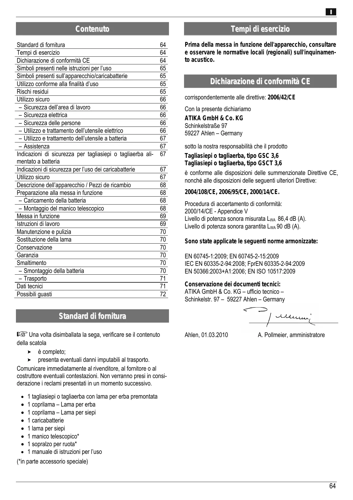 Prima della messa in funzione dell'apparecchio, consultare e osservare le normative locali (regionali) sull'inquinamento acustico. Dichiarazione di conformità CE corrispondentemente alle direttive: 2006/42/CE Con la presente dichiariamo ATIKA GmbH & Co. KG Schinkelstraße 97 59227 Ahlen – Germany sotto la nostra responsabilità che il prodotto Tagliasiepi o tagliaerba, tipo GSC 3,6 Tagliasiepi o tagliaerba, tipo GSCT 3,6 è conforme alle disposizioni delle summenzionate Direttive CE, nonché alle disposizioni delle seguenti ulteriori Direttive: 2004/108/CE, 2006/95/CE, 2000/14/CE. Procedura di accertamento di conformità: 2000/14/CE - Appendice V Livello di potenza sonora misurata LWA 86,4 dB (A). Livello di potenza sonora garantita LWA 90 dB (A). Sono state applicate le seguenti norme armonizzate: EN 60745-1:2009; EN 60745-2-15:2009 IEC EN 60335-2-94:2008; FprEN 60335-2-94:2009