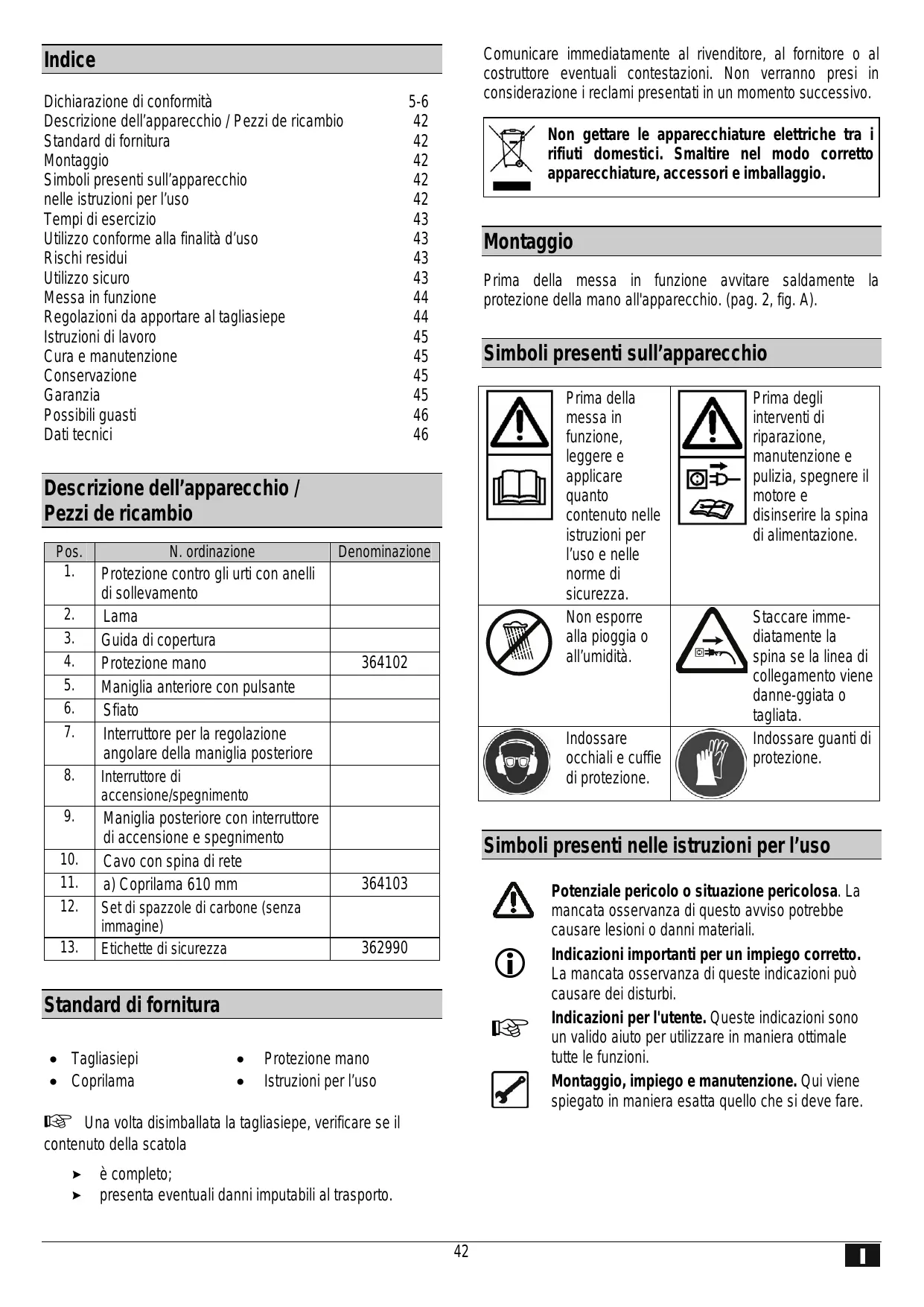 Comunicare immediatamente al rivenditore, al fornitore o al costruttore eventuali contestazioni. Non verranno presi in considerazione i reclami presentati in un momento successivo. Indice Dichiarazione di conformità Descrizione dell’apparecchio / Pezzi de ricambio Standard di fornitura Montaggio Simboli presenti sull’apparecchio nelle istruzioni per l’uso Tempi di esercizio Utilizzo conforme alla finalità d’uso Rischi residui Utilizzo sicuro Messa in funzione Regolazioni da apportare al tagliasiepe Istruzioni di lavoro Cura e manutenzione Conservazione Garanzia Possibili guasti Dati tecnici 5-6