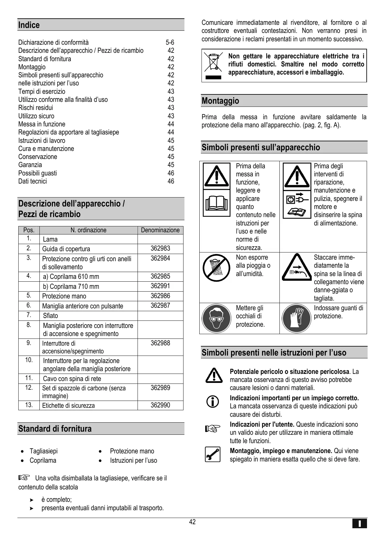 Comunicare immediatamente al rivenditore, al fornitore o al costruttore eventuali contestazioni. Non verranno presi in considerazione i reclami presentati in un momento successivo. Indice Dichiarazione di conformità Descrizione dell’apparecchio / Pezzi de ricambio Standard di fornitura Montaggio Simboli presenti sull’apparecchio nelle istruzioni per l’uso Tempi di esercizio Utilizzo conforme alla finalità d’uso Rischi residui Utilizzo sicuro Messa in funzione Regolazioni da apportare al tagliasiepe Istruzioni di lavoro Cura e manutenzione Conservazione Garanzia Possibili guasti Dati tecnici 5-6