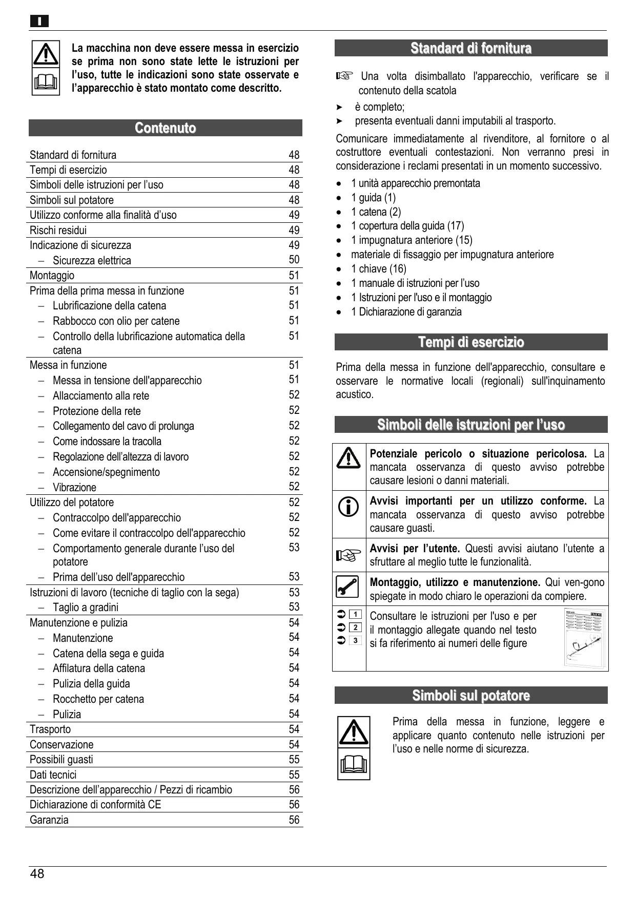 Standard di fornitura 48 Tempi di esercizio 48 Simboli delle istruzioni per l'uso 48 Simboli sul potatore 48 Utilizzo conforme alla finalità d'uso 49 Rischi residui 49 Indicazione di sicurezza 49 — _Sicurezza elettrica 50 Montaggio 51 Prima della prima messa in funzione 51 — Lubrificazione della catena 51 — Rabbocco con olio per catene 51 —_ Controllo della lubrificazione automatica della 51 catena Messa in funzione 51 — Messa in tensione dell'apparecchio 51 — Allacciamento alla rete 52 — Protezione della rete 52 — _ Collegamento del cavo di prolunga 52 — Come indossare la tracolla 52 — _ Regolazione dell'altezza di lavoro 52 — Accensione/spegnimento 52 —_Vibrazione 52 Uïiilizzo del potatore 52 —_ Contraccolpo dell'apparecchio 52 — Come evitare il contraccolpo dell'apparecchio 52 — Comportamento generale durante l'uso del 53 potatore — Prima dell'uso dell'apparecchio 53 Istruzioni di lavoro (tecniche di taglio con la sega) 53 — _Taglio a gradini 53 Manutenzione e pulizia 54 — Manutenzione 54 — Catena della sega e guida 54 — Affilatura della catena 54 — _ Pulizia della guida 54 — Rocchetto per catena 54 —_ Pulizia 54 Trasporto 54 Conservazione 54 Possibili guasti 55 Dati tecnici 55 Descrizione dell'apparecchio / Pezzi di ricambio 56 Dichiarazione di conformità CE 56 Garanzia 56