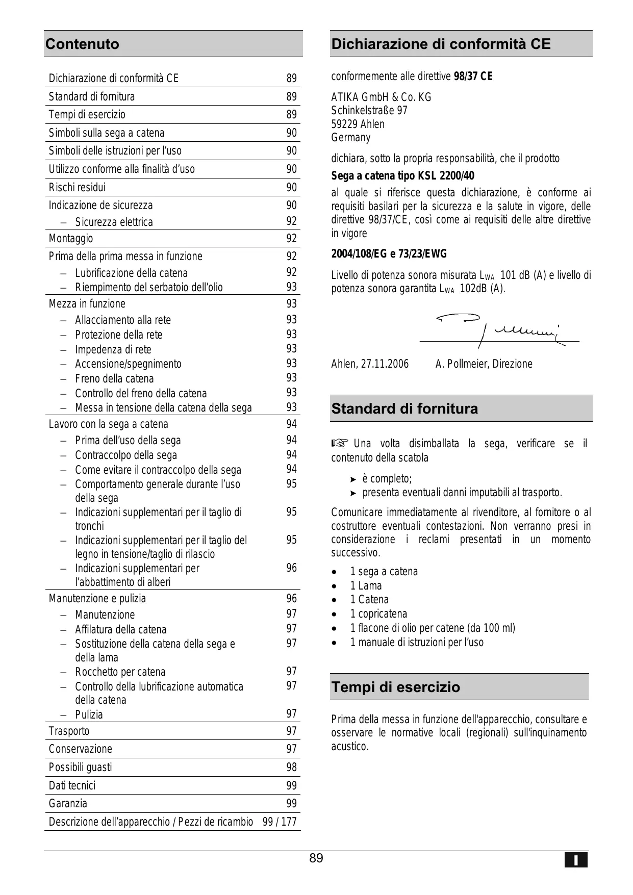 Dichiarazione di conformità CE Dichiarazione di conformità CE 89 Standard di fornitura 89 Tempi di esercizio 89 Simboli sulla sega a catena 90 Simboli delle istruzioni per l'uso 90 Utilizzo conforme alla finalità d'uso 90 Rischi residui 90 Indicazione de sicurezza 90 — _Sicurezza elettrica 92 Montaggio 92 Prima della prima messa in funzione 92 — _Lubrificazione della catena 92 — _Riempimento del serbatoio dell'olio 93 Mezza in funzione 93 — Allacciamento alla rete 93 — Protezione della rete 93 — Impedenza direte 93 — Accensione/spegnimento 93 — _ Freno della catena 93 — Controllo del freno della catena 93 — _Messa in tensione della catena della sega 93 Lavoro con la sega à catena 94 — Prima dell'uso della sega 94 — Contraccolpo della sega 94 — Come evitare il contraccolpo della sega 94 — Comportamento generale durante l'uso 95 della sega —_Indicazioni supplementari per il taglio di 95 tronchi —_Indicazioni supplementari per il taglio del 95 legno in tensione/taglio di rilascio — _Indicazioni supplementari per 96 l'abbattimento di alberi Manutenzione e pulizia 96 — Manutenzione 97 — Affilatura della catena 97 — Sostituzione della catena della sega e 97 della lama — _Rocchetto per catena 97 — Controllo della lubrificazione automatica 97 della catena — _Pulizia 97 Trasporto 97 Conservazione 97 Possibili guasti 98 Dati tecnici 99 Garanzia 99 Descrizione dell'apparecchio / Pezzi de ricambio 99/177