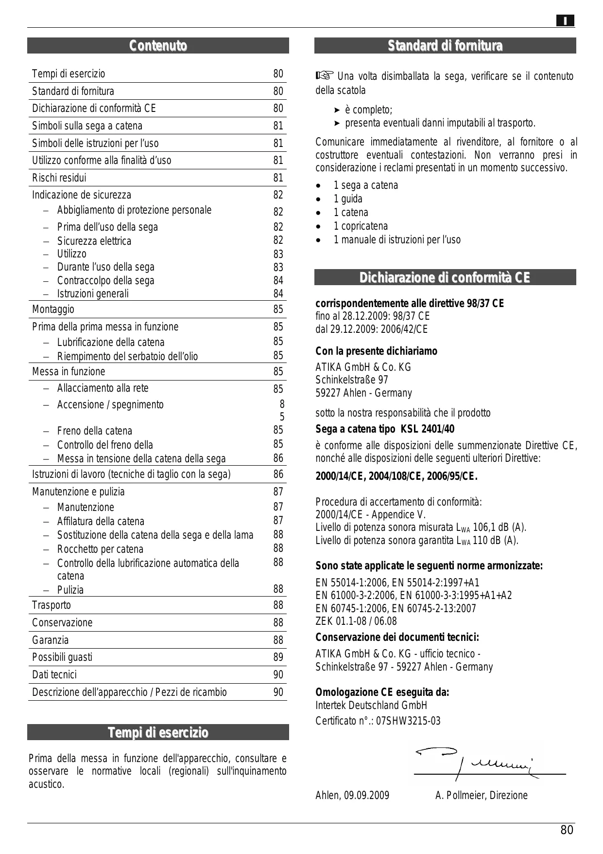 Dichiarazione di conformità CE corrispondentemente alle direttive 98/37 CE fino al 28.12.2009: 98/37 CE dal 29.12.2009: 2006/42/CE Con la presente dichiariamo ATIKA GmbH & Co. KG Schinkelstraße 97 59227 Ahlen - Germany sotto la nostra responsabilità che il prodotto Sega a catena tipo KSL 2401/40 è conforme alle disposizioni delle summenzionate Direttive CE, nonché alle disposizioni delle seguenti ulteriori Direttive: 2000/14/CE, 2004/108/CE, 2006/95/CE. Procedura di accertamento di conformità: 2000/14/CE - Appendice V. Livello di potenza sonora misurata LWA 106,1 dB (A). Livello di potenza sonora garantita LWA 110 dB (A). Sono state applicate le seguenti norme armonizzate: EN 55014-1:2006, EN 55014-2:1997+A1 EN 61000-3-2:2006, EN 61000-3-3:1995+A1+A2 EN 60745-1:2006, EN 60745-2-13:2007 ZEK 01.1-08 / 06.08 Conservazione dei documenti tecnici: ATIKA GmbH & Co. KG - ufficio tecnico Schinkelstraße 97 - 59227 Ahlen - Germany Omologazione CE eseguita da: Intertek Deutschland GmbH Certificato n°.: 07SHW3215-03