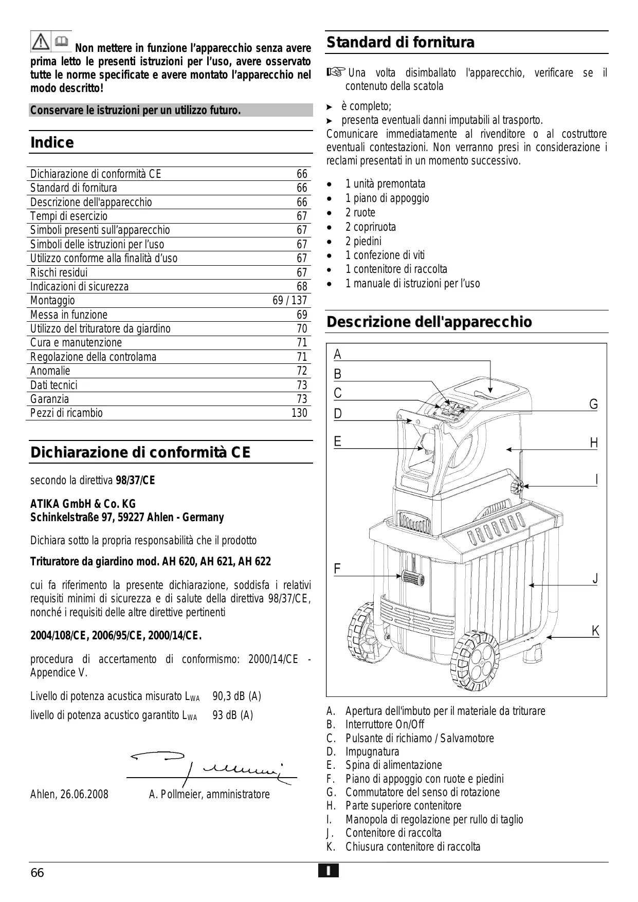 Dichiarazione di conformità CE 66 Standard di fornitura 66 Descrizione dell'apparecchio 66 Tempi di esercizio 67 Simboli presenti sull'apparecchio 67 Simboli delle istruzioni per l'uso 67 Utilizzo conforme alla finalità d'uso 67 Rischi residui 67 Indicazioni di sicurezza 68 Montaggio 69/137 Messa in funzione 69 Utilizzo del trituratore da giardino 70 Cura e manutenzione 71 Regolazione della controlama 71 Anomalie nm Dati tecnici 73 Garanzia 73 Pezzi di ricambio 130
