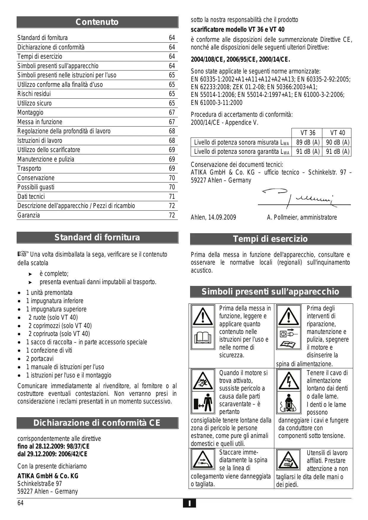 sotto la nostra responsabilità che il prodotto scarificatore modello VT 36 e VT 40 è conforme alle disposizioni delle summenzionate Direttive CE, nonché alle disposizioni delle seguenti ulteriori Direttive: 2004/108/CE, 2006/95/CE, 2000/14/CE. Sono state applicate le seguenti norme armonizzate: EN 60335-1:2002+A1+A11+A12+A2+A13; EN 60335-2-92:2005; EN 62233:2008; ZEK 01.2-08; EN 50366:2003+A1; EN 55014-1:2006; EN 55014-2:1997+A1; EN 61000-3-2:2006; EN 61000-3-11:2000 Procedura di accertamento di conformità: 2000/14/CE - Appendice V.