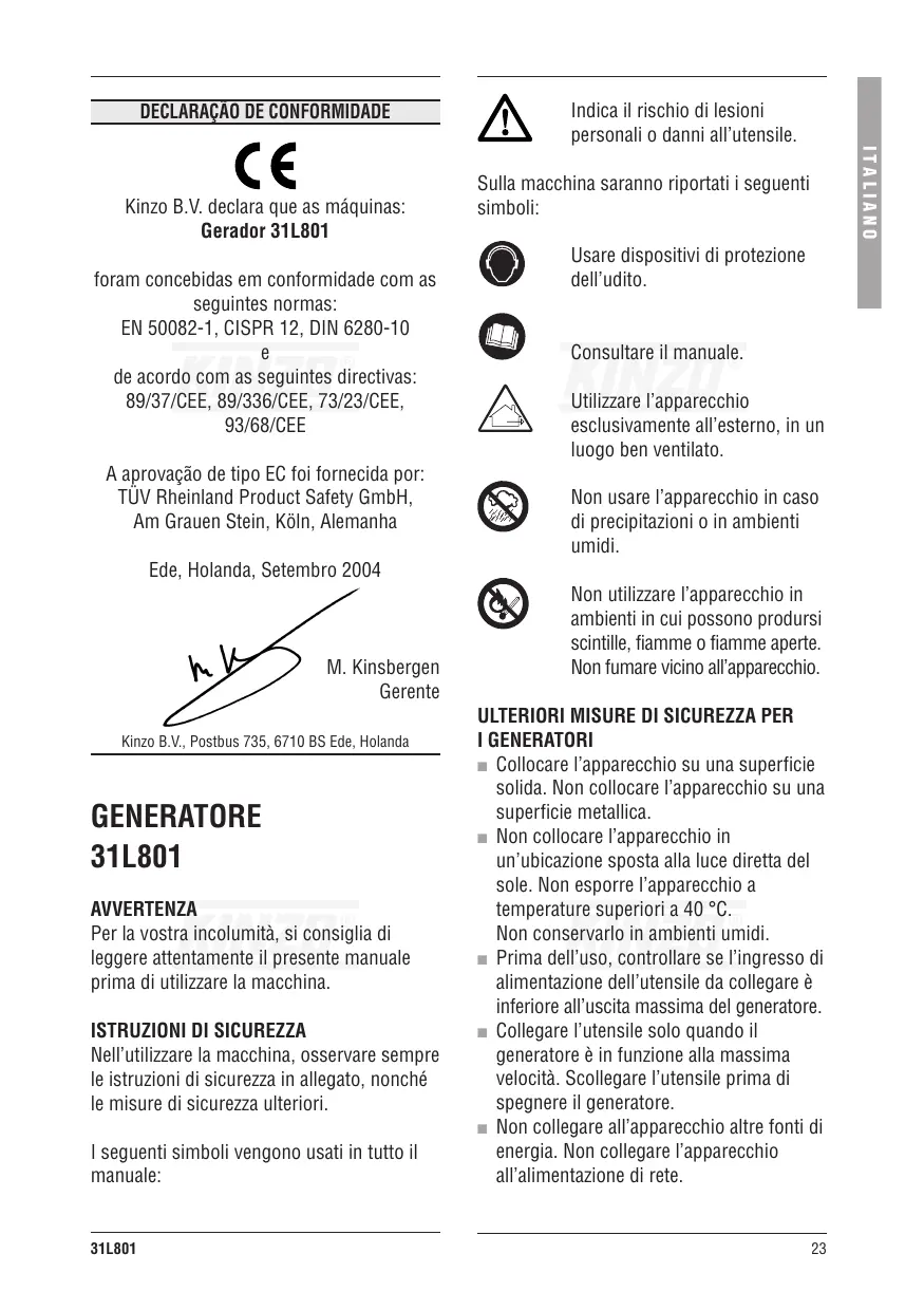 de acordo com as seguintes directivas: 89/37/CEE, 89/336/CEE, 73/23/CEE, 93/68/CEE A aprovação de tipo EC foi fornecida por: TÜV Rheinland Product Safety GmbH, Am Grauen Stein, Köln, Alemanha ITALIANO Kinzo B.V. declara que as máquinas: Gerador 31L801 Indica il rischio di lesioni personali o danni all’utensile. Sulla macchina saranno riportati i seguenti simboli: Usare dispositivi di protezione dell’udito. Consultare il manuale. Utilizzare l’apparecchio esclusivamente all’esterno, in un luogo ben ventilato. Non usare l’apparecchio in caso di precipitazioni o in ambienti umidi. Ede, Holanda, Setembro 2004 M. Kinsbergen Gerente Kinzo B.V., Postbus 735, 6710 BS Ede, Holanda GENERATORE 31L801 AVVERTENZA Per la vostra incolumità, si consiglia di leggere attentamente il presente manuale prima di utilizzare la macchina.