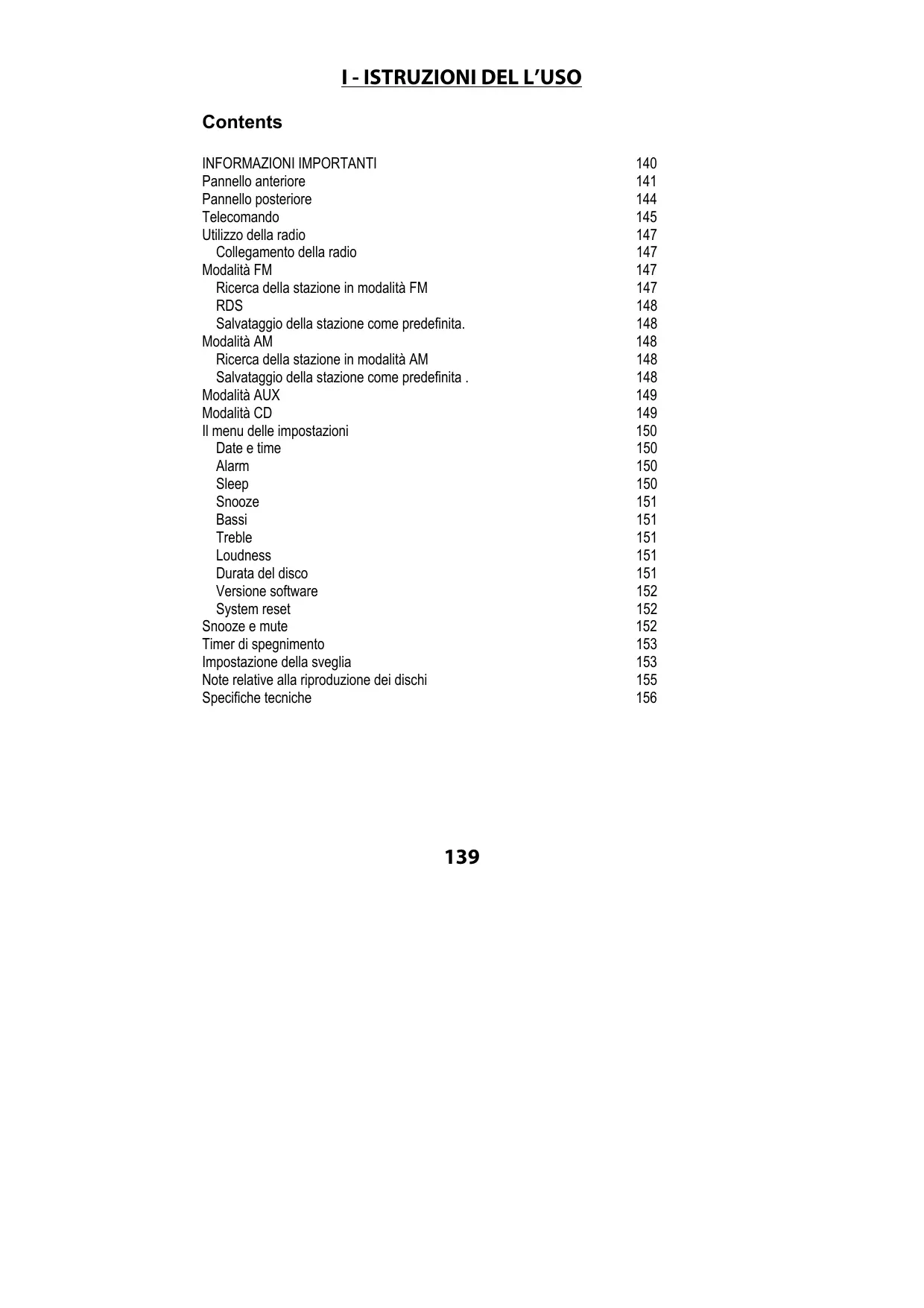 Contents INFORMAZIONI IMPORTANTI Pannello anteriore Pannello posteriore Telecomando Utilizzo della radio Collegamento della radio Modalità FM Ricerca della stazione in modalità FM RDS Salvataggio della stazione come predefinita. Modalità AM Ricerca della stazione in modalità AM Salvataggio della stazione come predefinita . Modalità AUX Modalità CD Il menu delle impostazioni Date e time Alarm Sleep Snooze Bassi Treble Loudness Durata del disco Versione software System reset Snooze e mute Timer di spegnimento Impostazione della sveglia Note relative alla riproduzione dei dischi Specifiche tecniche