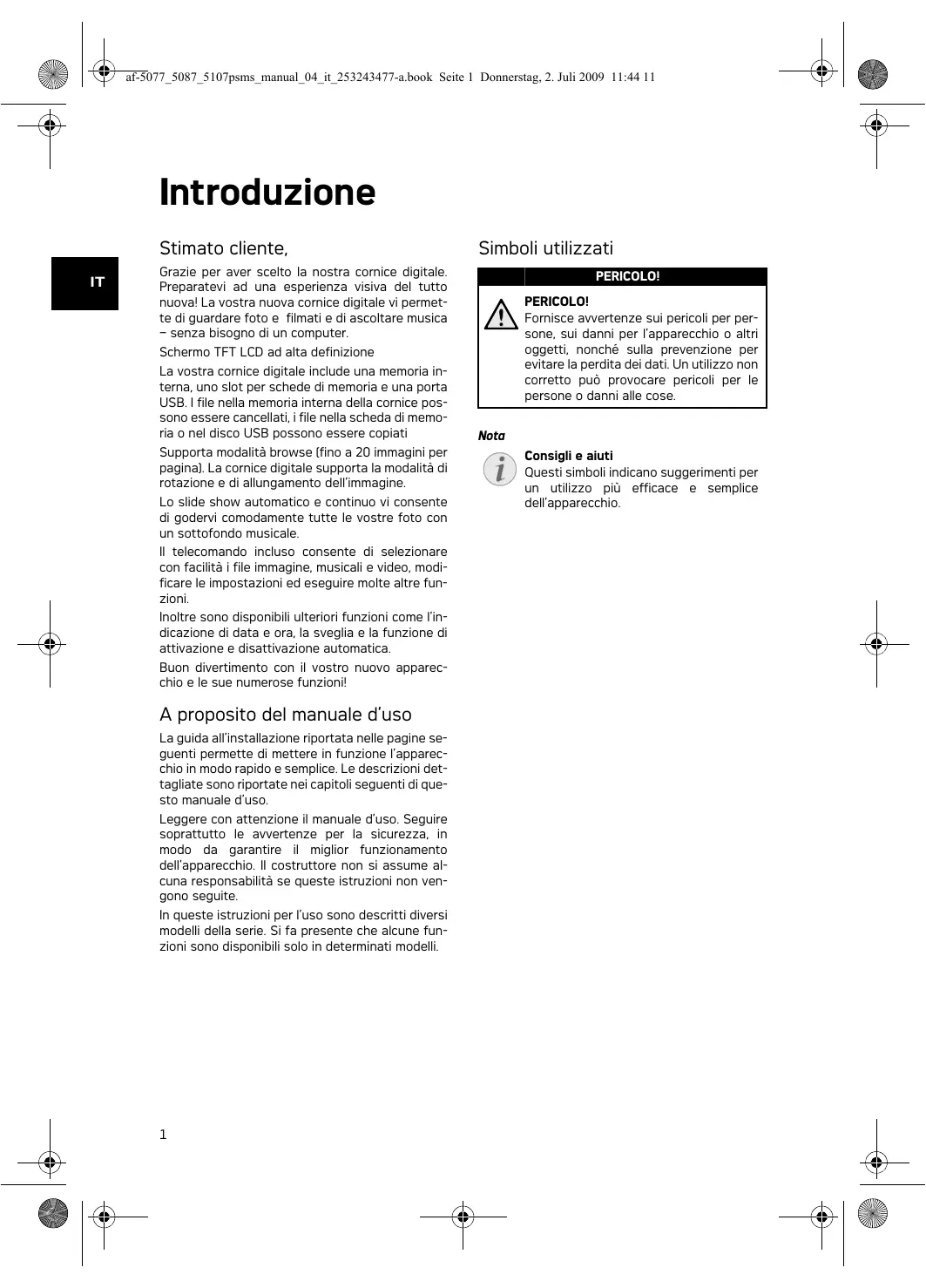 Grazie per aver scelto la nostra cornice digitale. Preparatevi ad una esperienza visiva del tutto nuova! La vostra nuova cornice digitale vi permette di guardare foto e filmati e di ascoltare musica – senza bisogno di un computer. Simboli utilizzati Avvertenza sui pericoli PERICOLO! PERICOLO! Fornisce avvertenze sui pericoli per persone, sui danni per l’apparecchio o altri oggetti, nonché sulla prevenzione per evitare la perdita dei dati. Un utilizzo non corretto può provocare pericoli per le persone o danni alle cose. Schermo TFT LCD ad alta definizione Memoria La vostra cornice digitale include una memoria interna, uno slot per schede di memoria e una porta USB. I file nella memoria interna della cornice possono essere cancellati, i file nella scheda di memoria o nel disco USB possono essere copiati Supporta modalità browse (fino a 20 immagini per pagina). La cornice digitale supporta la modalità di rotazione e di allungamento dell’immagine. Lo slide show automatico e continuo vi consente di godervi comodamente tutte le vostre foto con un sottofondo musicale. Il telecomando incluso consente di selezionare con facilità i file immagine, musicali e video, modificare le impostazioni ed eseguire molte altre funzioni. Inoltre sono disponibili ulteriori funzioni come l’indicazione di data e ora, la sveglia e la funzione di attivazione e disattivazione automatica. Buon divertimento con il vostro nuovo apparecchio e le sue numerose funzioni! A proposito del manuale d’uso La guida all’installazione riportata nelle pagine seguenti permette di mettere in funzione l’apparecchio in modo rapido e semplice. Le descrizioni dettagliate sono riportate nei capitoli seguenti di questo manuale d’uso. Leggere con attenzione il manuale d’uso. Seguire soprattutto le avvertenze per la sicurezza, in modo da garantire il miglior funzionamento dell’apparecchio. Il costruttore non si assume alcuna responsabilità se queste istruzioni non vengono seguite. In queste istruzioni per l’uso sono descritti diversi modelli della serie. Si fa presente che alcune funzioni sono disponibili solo in determinati modelli.