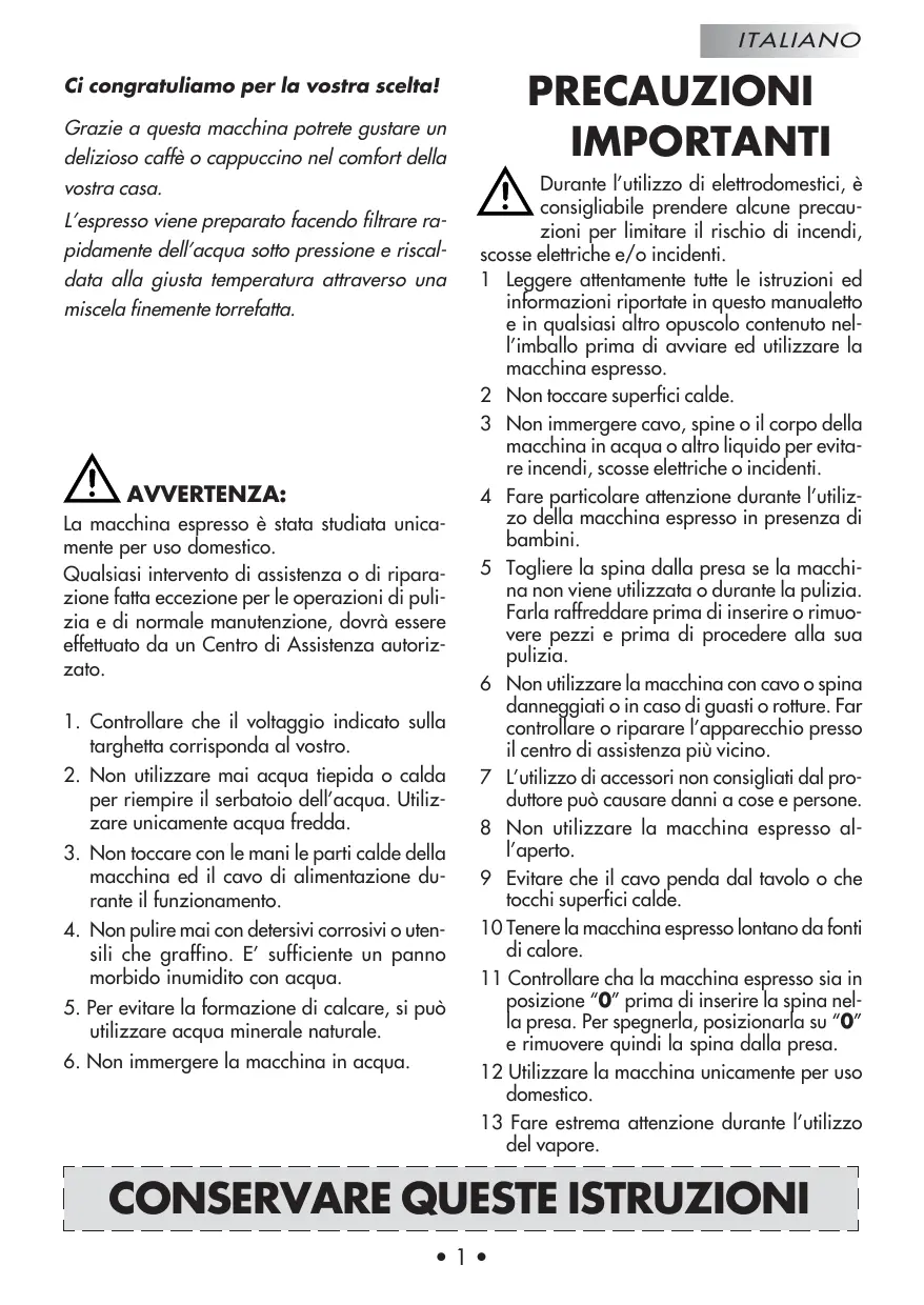 Cette machine est réservée à un usage domestique. Toute intervention d’assistance ou de réparation, exception faite des opérations de nettoyage et d’entretien courant, devra être effectuée par un Centre d’assistance agréé. 1. Vérifier si le voltage correspond bien aux spécifications apparaissant sur la plaque des données techniques. 2. Ne jamais mettre de l’eau tiède ou chaude dans le réservoir, mais toujours de l’eau froide. 3. Ne pas toucher les surfaces chaudes de l’appareil pendant le fonctionnement et en écarter le cordon électrique. 4. Ne jamais nettoyer avec des poudres à récurer ou des instruments durs. 5. Utiliser de l’eau purifiée ou en bouteille pour éviter la formation de tartre. 6. Ne pas plonger la base dans l’eau.