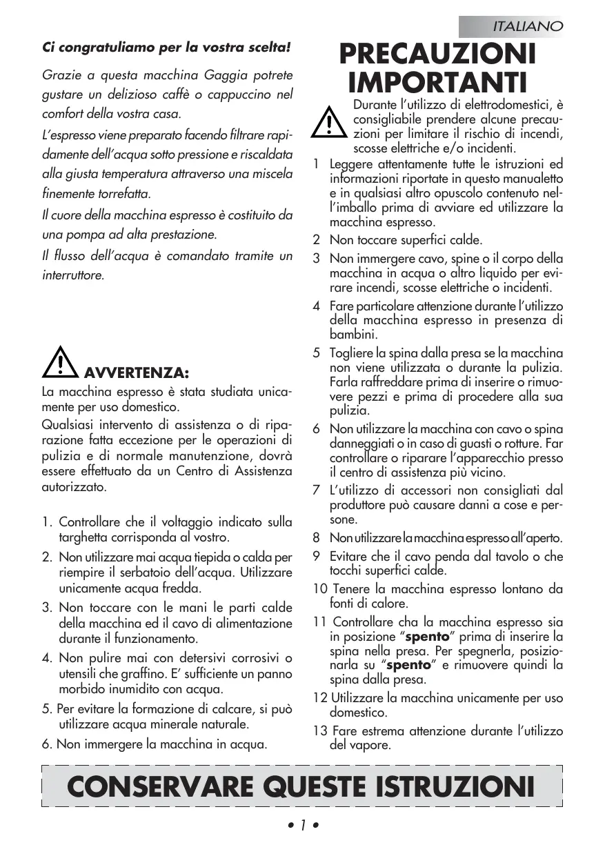 AVVERTENZA: La macchina espresso è stata studiata unicamente per uso domestico. Qualsiasi intervento di assistenza o di riparazione fatta eccezione per le operazioni di pulizia e di normale manutenzione, dovrà essere effettuato da un Centro di Assistenza autorizzato. 1. Controllare che il voltaggio indicato sulla targhetta corrisponda al vostro. 2. Non utilizzare mai acqua tiepida o calda per riempire il serbatoio dell’acqua. Utilizzare unicamente acqua fredda. 3. Non toccare con le mani le parti calde della macchina ed il cavo di alimentazione durante il funzionamento. 4. Non pulire mai con detersivi corrosivi o utensili che graffino. E’ sufficiente un panno morbido inumidito con acqua. 5. Per evitare la formazione di calcare, si può utilizzare acqua minerale naturale. 6. Non immergere la macchina in acqua.