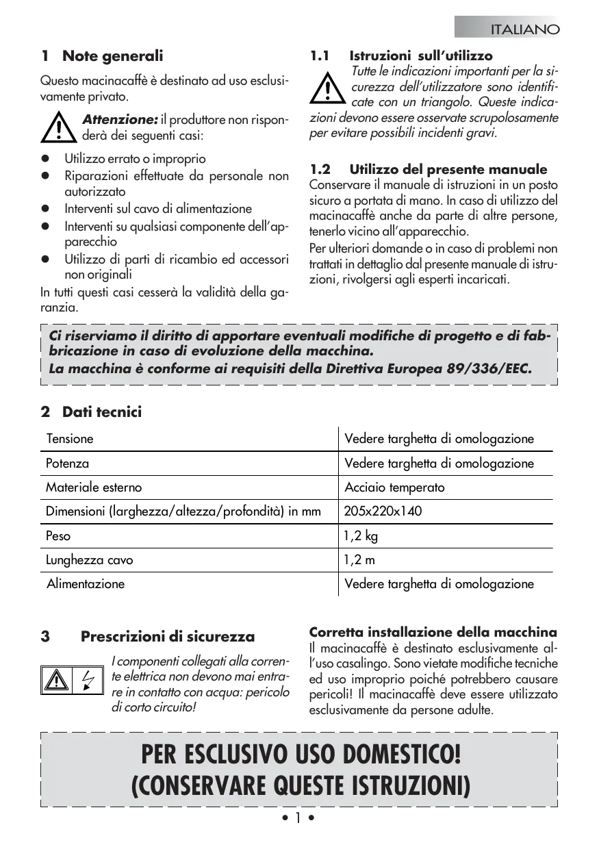 PER ESCLUSIVO USO DOMESTICO! (CONSERVARE QUESTE ISTRUZIONI) •1•