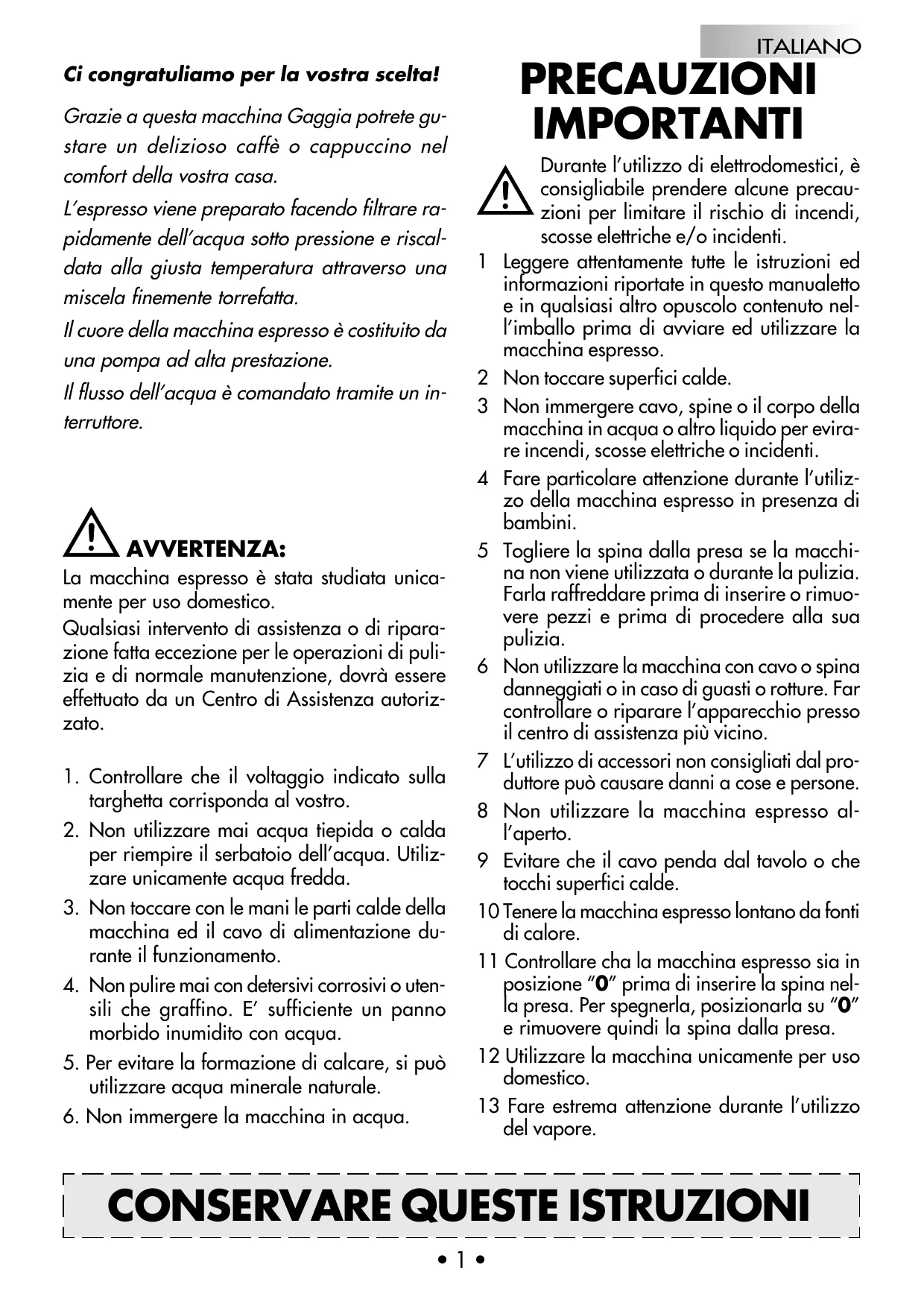 La machine Gaggia est maintenant prête. REMARQUE: Il est possible que l’amorçage automatique de la pompe ne fonctionne pas momentanément, à cause de la «bulle d’air». Au cas où l’eau ne descendrait pas de l’élément percolateur: a) Placez un petit pot à lait ou une tasse sous le bec à vapeur Turbo (8). b) Tournez le bouton (7) au sommet de l’appareil dans le sens contraire des aiguilles d’une montre, pour ouvrir la valve vapeur/ eau chaude et actionnez l’interrupteur vapeur (4) et l’interrupteur café/eau chaude jusqu’à la position “1” pour activer la pompe. c) Au bout de quelques secondes, un jet d’eau régulier sortira du bec à vapeur. Laissez couler environ une tasse d’eau. Puis fermez la valve vapeur/eau chaude et fermez l’interrupteur café/ eau chaude et l’interrupteur vapeur (4) sur la position “0”. La machine Gaggia est maintenant prête. d) NOTE: Le voyant de température (3) clignote pendant que l’eau chauffe. Il s’allume automatiquement lorsqu’elle a atteint la bonne température pour le café (et la vapeur). Après avoir allumé la machine, pour obtenir le premier café, attendez environ 6 minutes pour un chauffage idéal, alors que pour les suivants, la machine sera toujours prête. La machine se caractérise également par le système antigoutte qui élimine la plupart du liquide s’égouttant du groupe de distribution (14). Lorsque le café s’est écoulé, il peut se produire un léger égouttement à cause du marc de café mouillé contenu dans le portefiltre. ATTENTION: Ne jamais mettre la machine en marche lorsque le réservoir est vide, afin d’éviter d’endommager la pompe. Une utilisation incorrecte n’est pas couverte par la garantie.