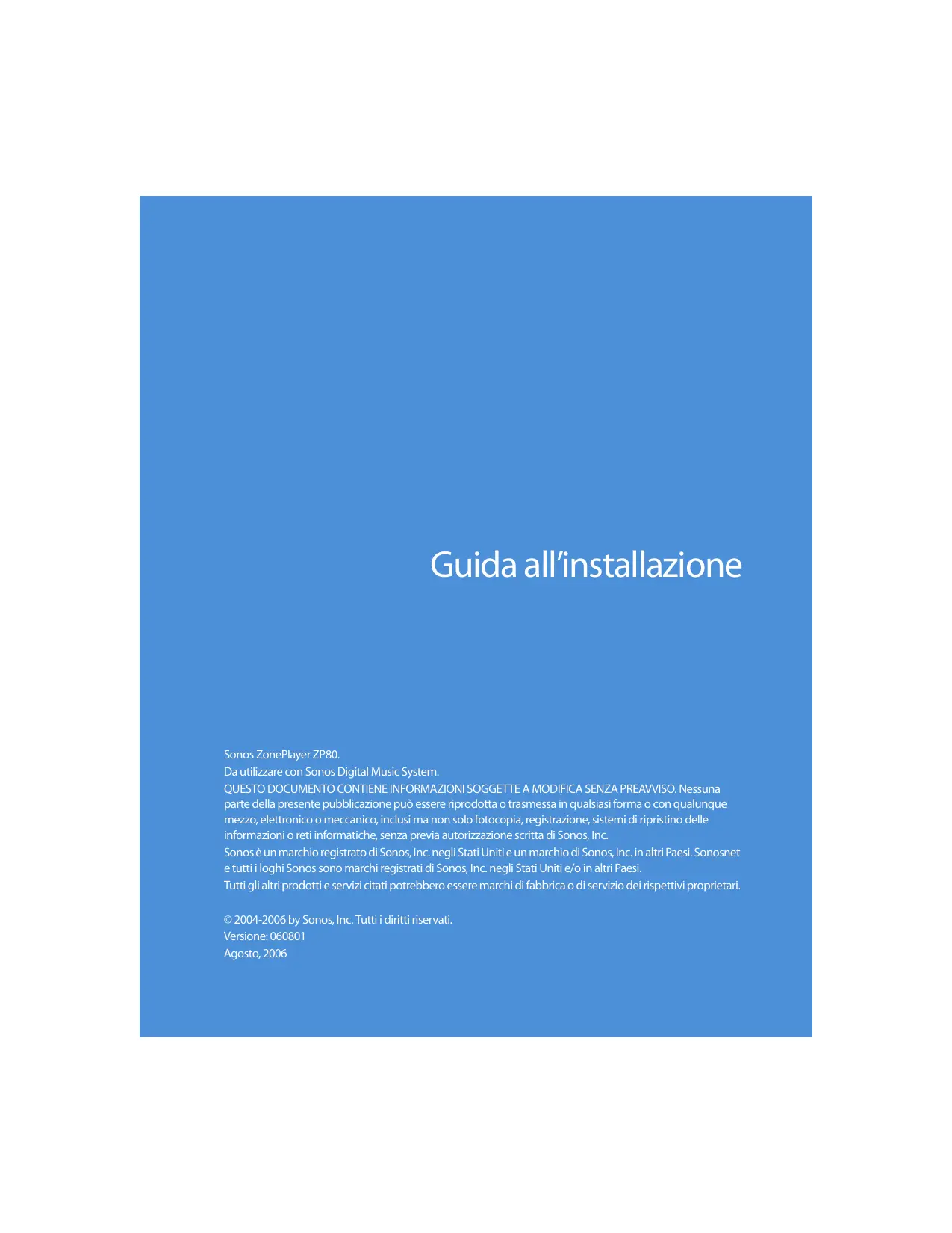 tales como vasos, encima del aparato. Advertencia: A fin de evitar el daño en los altavoces, apague el amplificador externo antes de desenchufar el ZonePlayer ZP80. Guida all’installazione Sonos ZonePlayer ZP80. Da utilizzare con Sonos Digital Music System. QUESTO DOCUMENTO CONTIENE INFORMAZIONI SOGGETTE A MODIFICA SENZA PREAVVISO. Nessuna parte della presente pubblicazione può essere riprodotta o trasmessa in qualsiasi forma o con qualunque mezzo, elettronico o meccanico, inclusi ma non solo fotocopia, registrazione, sistemi di ripristino delle informazioni o reti informatiche, senza previa autorizzazione scritta di Sonos, Inc. Sonos è un marchio registrato di Sonos, Inc. negli Stati Uniti e un marchio di Sonos, Inc. in altri Paesi. Sonosnet e tutti i loghi Sonos sono marchi registrati di Sonos, Inc. negli Stati Uniti e/o in altri Paesi. Tutti gli altri prodotti e servizi citati potrebbero essere marchi di fabbrica o di servizio dei rispettivi proprietari. © 2004-2006 by Sonos, Inc. Tutti i diritti riservati. Versione: 060801 Agosto, 2006