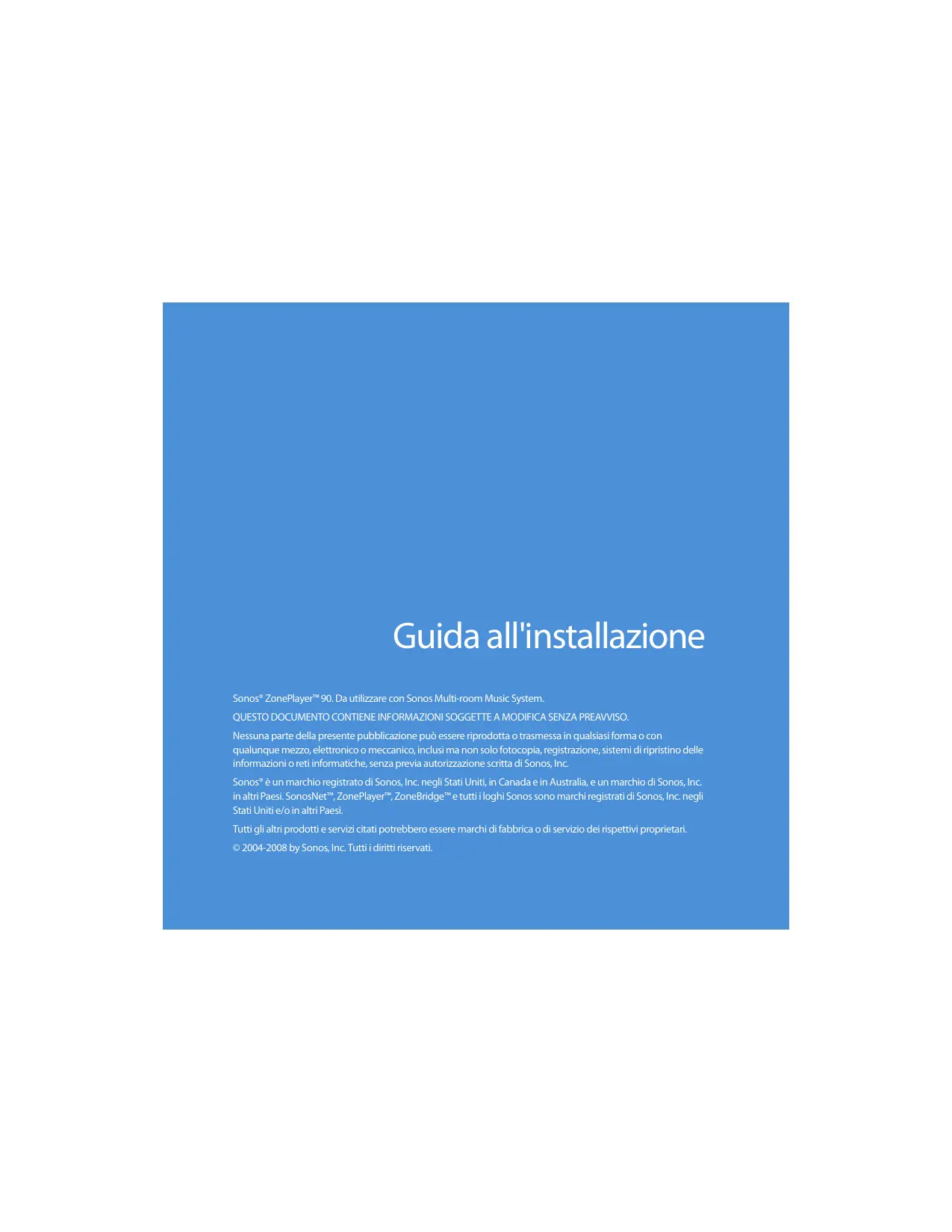 líquidos, tales como vasos, encima del aparato. Advertencia: A fin de evitar el daño en los altavoces, apague el amplificador externo antes de desenchufar el ZonePlayer 90. Guida all'installazione Sonos® ZonePlayer™ 90. Da utilizzare con Sonos Multi-room Music System. QUESTO DOCUMENTO CONTIENE INFORMAZIONI SOGGETTE A MODIFICA SENZA PREAVVISO. Nessuna parte della presente pubblicazione può essere riprodotta o trasmessa in qualsiasi forma o con qualunque mezzo, elettronico o meccanico, inclusi ma non solo fotocopia, registrazione, sistemi di ripristino delle informazioni o reti informatiche, senza previa autorizzazione scritta di Sonos, Inc. Sonos® è un marchio registrato di Sonos, Inc. negli Stati Uniti, in Canada e in Australia, e un marchio di Sonos, Inc. in altri Paesi. SonosNet™, ZonePlayer™, ZoneBridge™ e tutti i loghi Sonos sono marchi registrati di Sonos, Inc. negli Stati Uniti e/o in altri Paesi. Tutti gli altri prodotti e servizi citati potrebbero essere marchi di fabbrica o di servizio dei rispettivi proprietari. © 2004-2008 by Sonos, Inc. Tutti i diritti riservati.