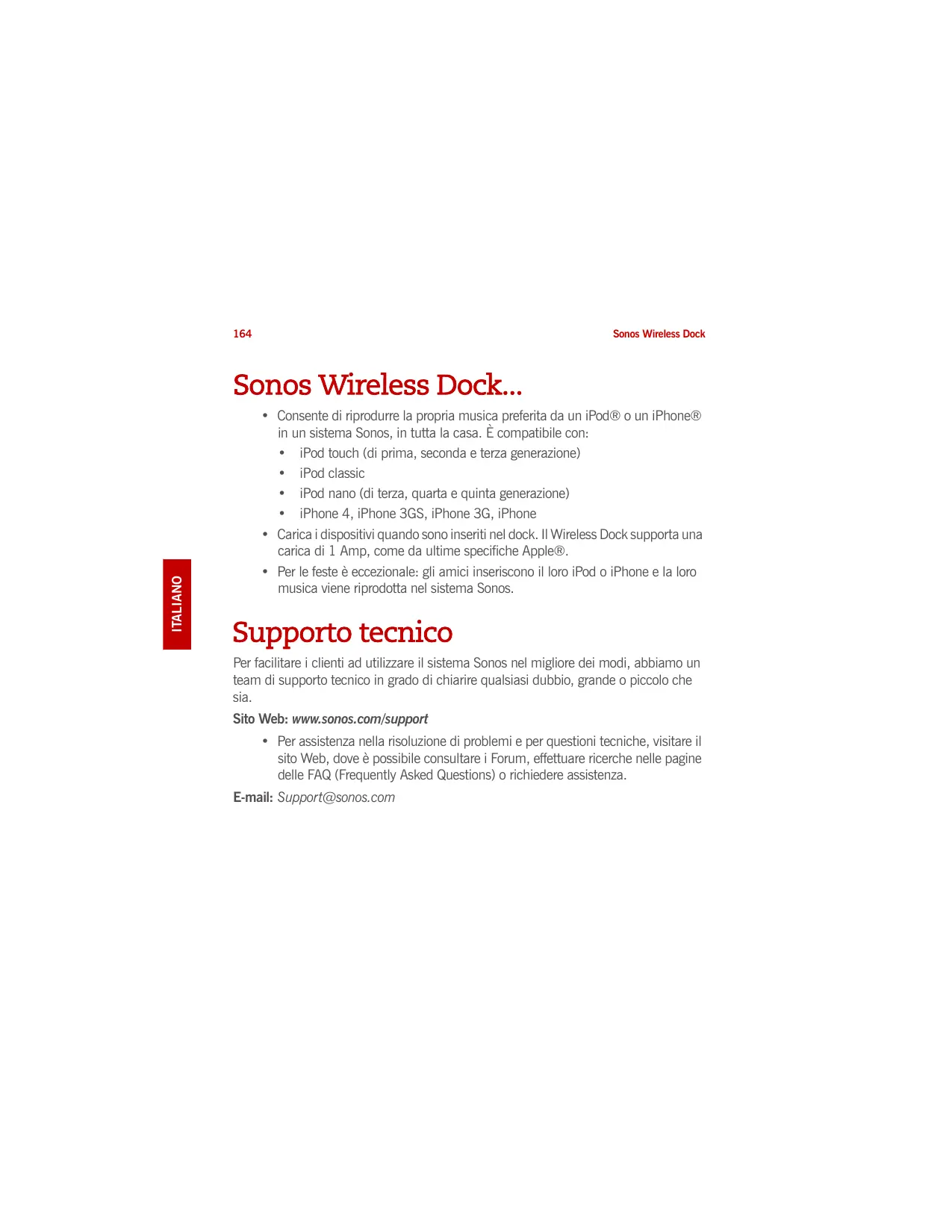 - Per assistenza nella risoluzione di problemi e per questioni tecniche, visitare il sito Web, dove è possibile consultare i Forum, effettuare ricerche nelle pagine delle FAQ (Frequently Asked Questions) o richiedere assistenza. E-mail: Support@sonos.com Sonos Wireless Dock
