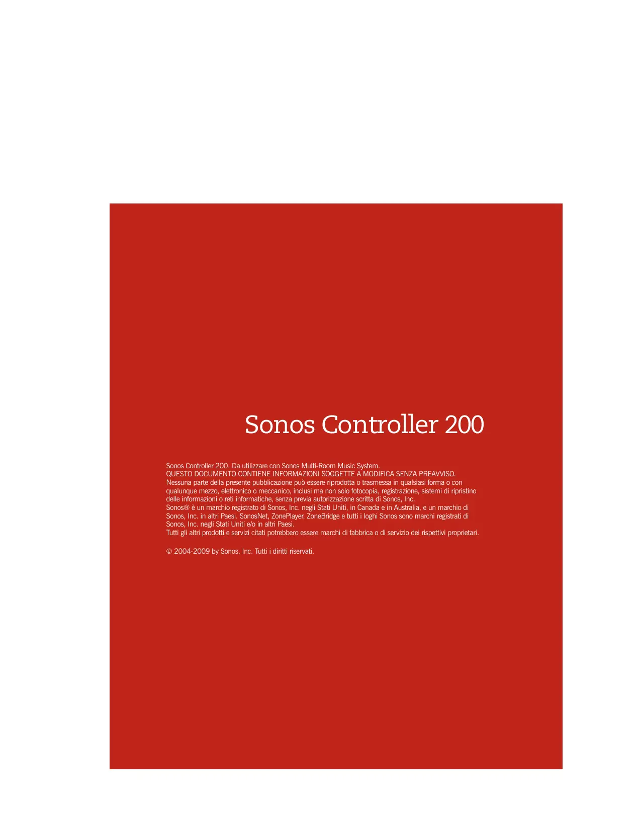 - Si necesita ayuda con la resolución de problemas, visite nuestro sitio Web donde podrá visitar los foros, explorar las páginas de preguntas más frecuentes o solicitar asistencia. NEDERLANDS Asistencia técnica ESPAÑOL Precaución: Los productos de limpieza o disolventes domésticos podrían dañar el acabado de los ZonePlayers o Controllers. Límpielos solamente con un paño suave y húmedo. ENGLISH Es probable que en alguna ocasión tenga que renovar el arriendo de DHCP (obtener una dirección IP nueva a través del servidor DHCP del proveedor). Si se da el caso, para reiniciar el Controller seleccione Ajustes→Ajustes de Controller→Ajustes avanzados→Reiniciar Controller en el Menú Música. ENGLISH ENGLISH ESPAÑOL ENGLISH Sonos Controller 200 Sonos Controller 200. Da utilizzare con Sonos Multi-Room Music System. QUESTO DOCUMENTO CONTIENE INFORMAZIONI SOGGETTE A MODIFICA SENZA PREAVVISO. Nessuna parte della presente pubblicazione può essere riprodotta o trasmessa in qualsiasi forma o con qualunque mezzo, elettronico o meccanico, inclusi ma non solo fotocopia, registrazione, sistemi di ripristino delle informazioni o reti informatiche, senza previa autorizzazione scritta di Sonos, Inc. Sonos® è un marchio registrato di Sonos, Inc. negli Stati Uniti, in Canada e in Australia, e un marchio di Sonos, Inc. in altri Paesi. SonosNet, ZonePlayer, ZoneBridge e tutti i loghi Sonos sono marchi registrati di Sonos, Inc. negli Stati Uniti e/o in altri Paesi. Tutti gli altri prodotti e servizi citati potrebbero essere marchi di fabbrica o di servizio dei rispettivi proprietari. © 2004-2009 by Sonos, Inc. Tutti i diritti riservati. SVENSKA ITALIANO DEUTSCH ENGLISH