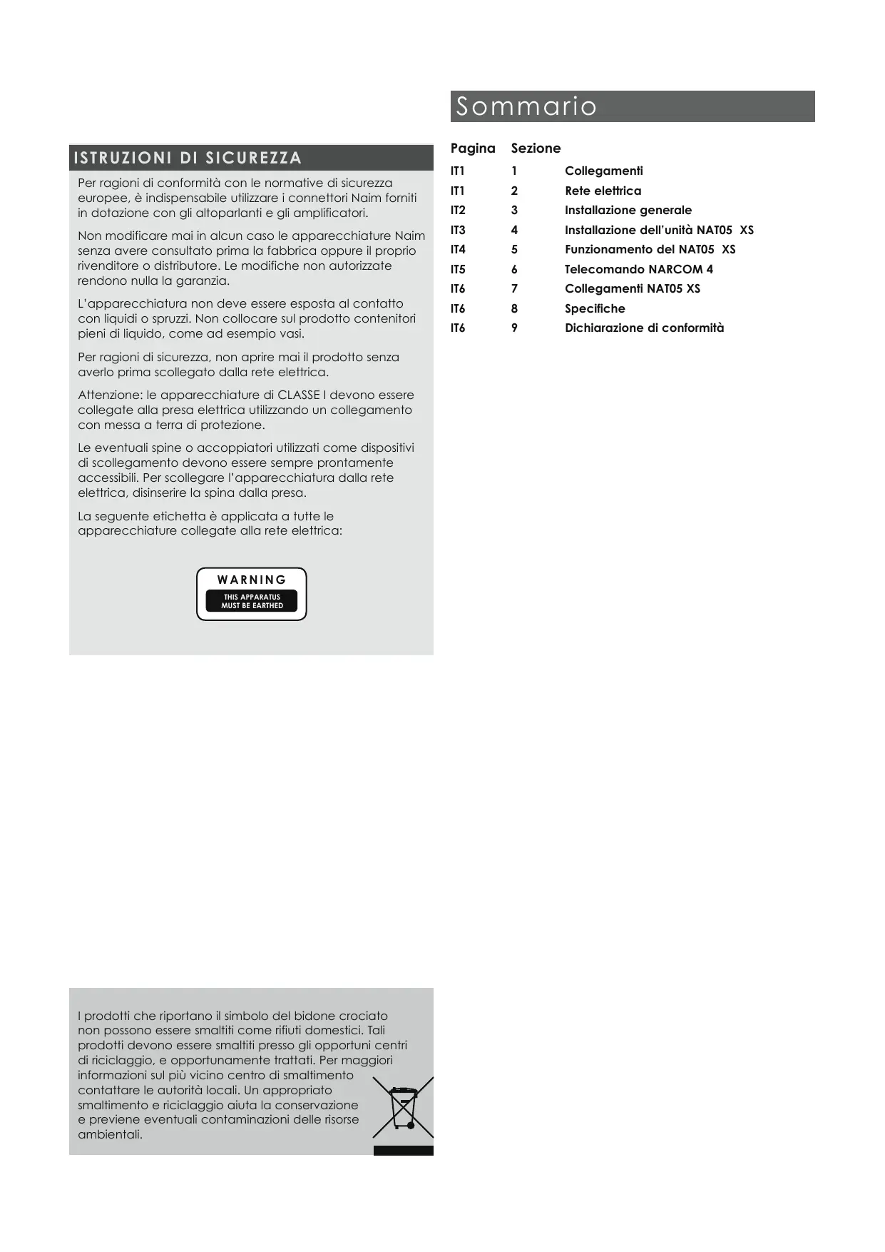 Collegamenti se Sen eron ue … m 2 Rete elettrica europee, à indispensabile utilzzare i connettori Naim forniti ” in dotazione con gli altoparlanti e gli amplificatori. IT2 3 Installazione generale Non modificare mai in aleun caso le apparecchiature Naim M3 4 Installazione dell'unltà NATOS X$ senza avere consultato prima la fabbrica oppure il proprio IT4 5 Funzionamento del NATO5 XS rivenditore o distributore. Le modifiche non autorizzate ns é Telecomando NARCOM 4 rendono nulla la garanzia. mé 7 Collegamenfi NATOS XS L'apparecchiatura non deve essere esposta al contatto m6 8 specifiche con liquidi o spruzzi. Non collocare sul prodotto contenitori Ne k mn mé 9 Dichiarazione di conformità pieni di liquido, come ad esempio vasi. Per ragioni di sicurezza, non aprire mai il prodotto senza averlo prima scollegato dalla rete elettrica. Attenzione: le apparecchiature di CLASSE | devono essere collegate alla presa elettrica utilizzando un collegamento con messa a terra di protezione. Le eventuali spine o accoppiatori utilzzati come dispositivi di scollegamento devono essere sempre prontamente accessibil. Per scollegare l'apparecchiatura dalla rete elettica, disinserire la spina dalla presa. La seguente etichetta à applicata a tutte le apparecchiature collegate alla rete elettrica: WARNING 1 prodotti che riportano il simbolo del bidone crociato non possono essere smalfiti come rifiuti domestici. Tali prodotti devono essere smaliti presso gli opportuni centri di riciclaggio, e opportunamente trattati. Per maggiori informazioni sul più vicino centro di smaltimento contattare le autorità locali. Un appropriato smaltimento e riciclaggio aiuta la conservazione e previene eventuali contaminazioni delle risorse ambientali.