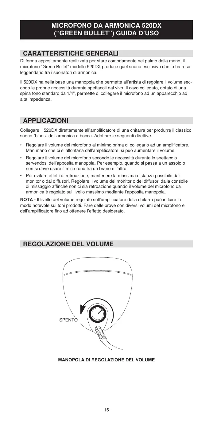 CARATTERISTICHE GENERALI Di forma appositamente realizzata per stare comodamente nel palmo della mano, il microfono “Green Bullet” modello 520DX produce quel suono esclusivo che lo ha reso leggendario tra i suonatori di armonica. Il 520DX ha nella base una manopola che permette all’artista di regolare il volume secondo le proprie necessità durante spettacoli dal vivo. Il cavo collegato, dotato di una spina fono standard da 1/4”, permette di collegare il microfono ad un apparecchio ad alta impedenza. APPLICAZIONI Collegare il 520DX direttamente all’amplificatore di una chitarra per produrre il classico suono “blues” dell’armonica a bocca. Adottare le seguenti direttive.