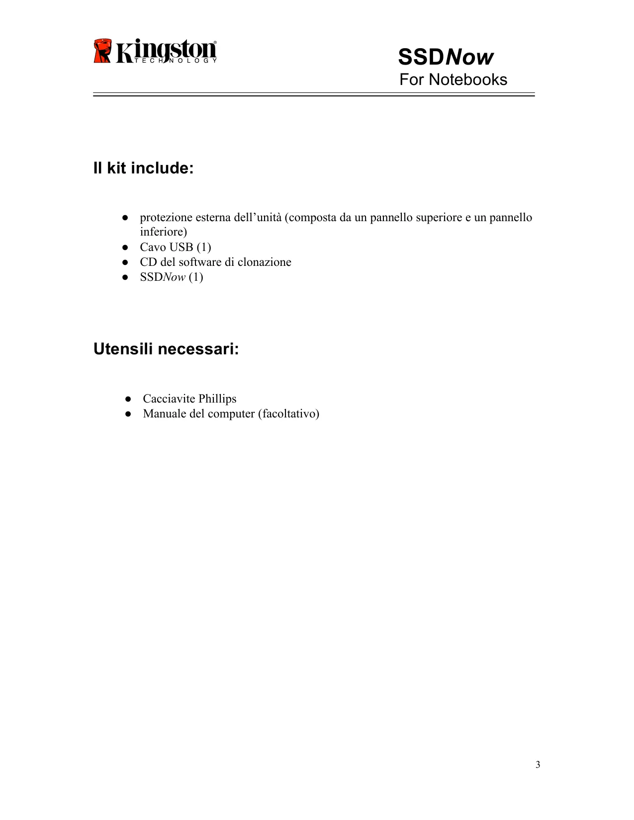 Il kit include: ● protezione esterna dell’unità (composta da un pannello superiore e un pannello inferiore) ● Cavo USB (1) ● CD del software di clonazione ● SSDNow (1)