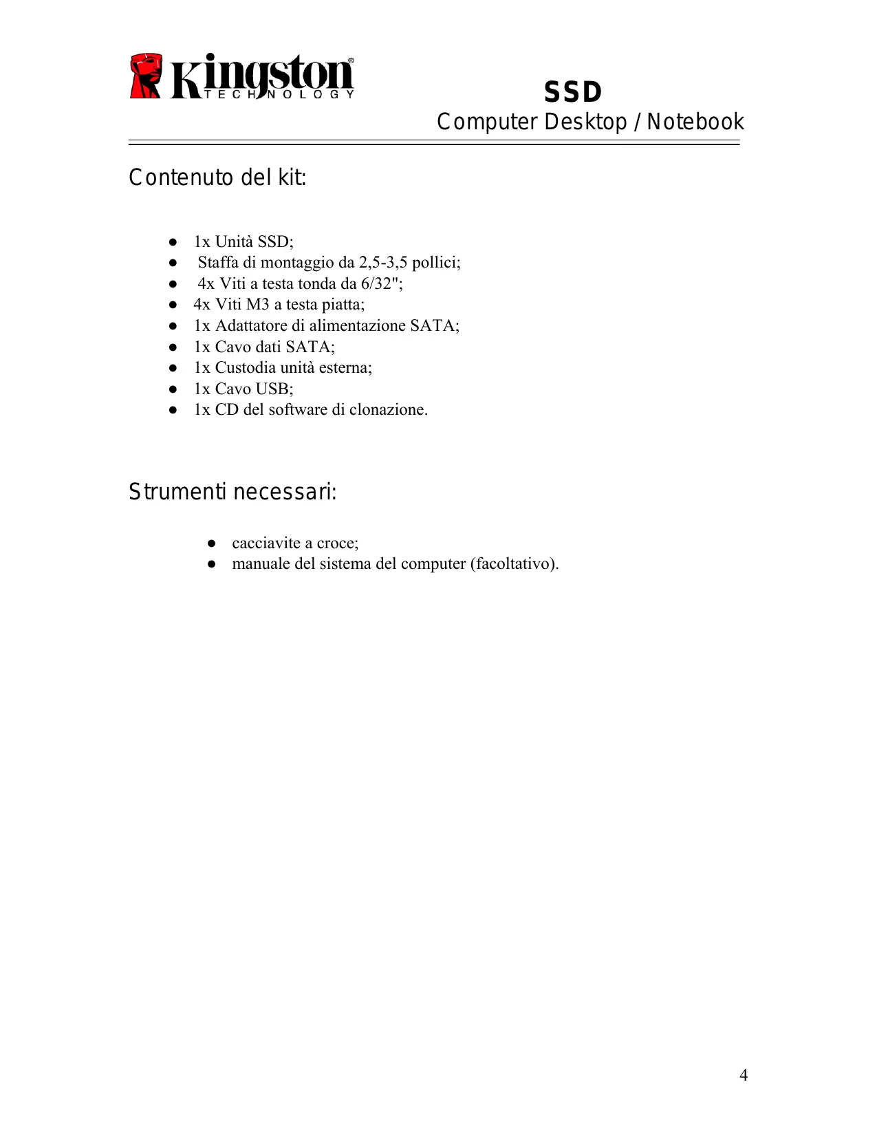 Scarica le istruzioni per il tuo SSD in formato PDF gratuitamente! Trova il tuo manuale SH100S3B - KINGSTON e riprendi in mano il tuo dispositivo elettronico. In questa pagina sono pubblicati tutti i documenti necessari per l'utilizzo del tuo dispositivo. SH100S3B del marchio KINGSTON.