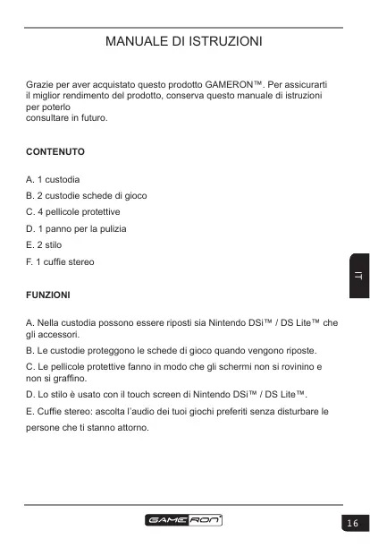 Scarica le istruzioni per il tuo Accessori per console di gioco in formato PDF gratuitamente! Trova il tuo manuale INITIAL PACK DSI - GAMERON e riprendi in mano il tuo dispositivo elettronico. In questa pagina sono pubblicati tutti i documenti necessari per l'utilizzo del tuo dispositivo. INITIAL PACK DSI del marchio GAMERON.