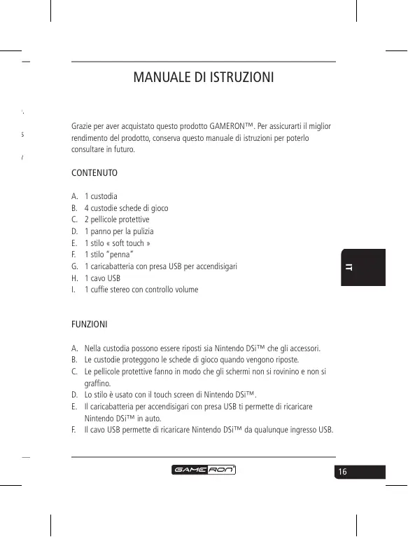 FUNZIONI A. Nella custodia possono essere riposti sia Nintendo DSi™ che gli accessori. B. Le custodie proteggono le schede di gioco quando vengono riposte. C. Le pellicole protettive fanno in modo che gli schermi non si rovinino e non si graffino. D. Lo stilo è usato con il touch screen di Nintendo DSi™. E. Il caricabatteria per accendisigari con presa USB ti permette di ricaricare Nintendo DSi™ in auto. F. Il cavo USB permette di ricaricare Nintendo DSi™ da qualunque ingresso USB.