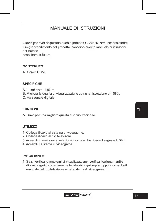 Grazie per aver acquistato questo prodotto GAMERON™. Per assicurarti il miglior rendimento del prodotto, conserva questo manuale di istruzioni per poterlo consultare in futuro. CONTENUTO A. 1 cavo HDMI SPECIFICHE A. Lunghezza: 1,80 m B. Migliora la qualità di visualizzazione con una risoluzione di 1080p C. Ha segnale digitale