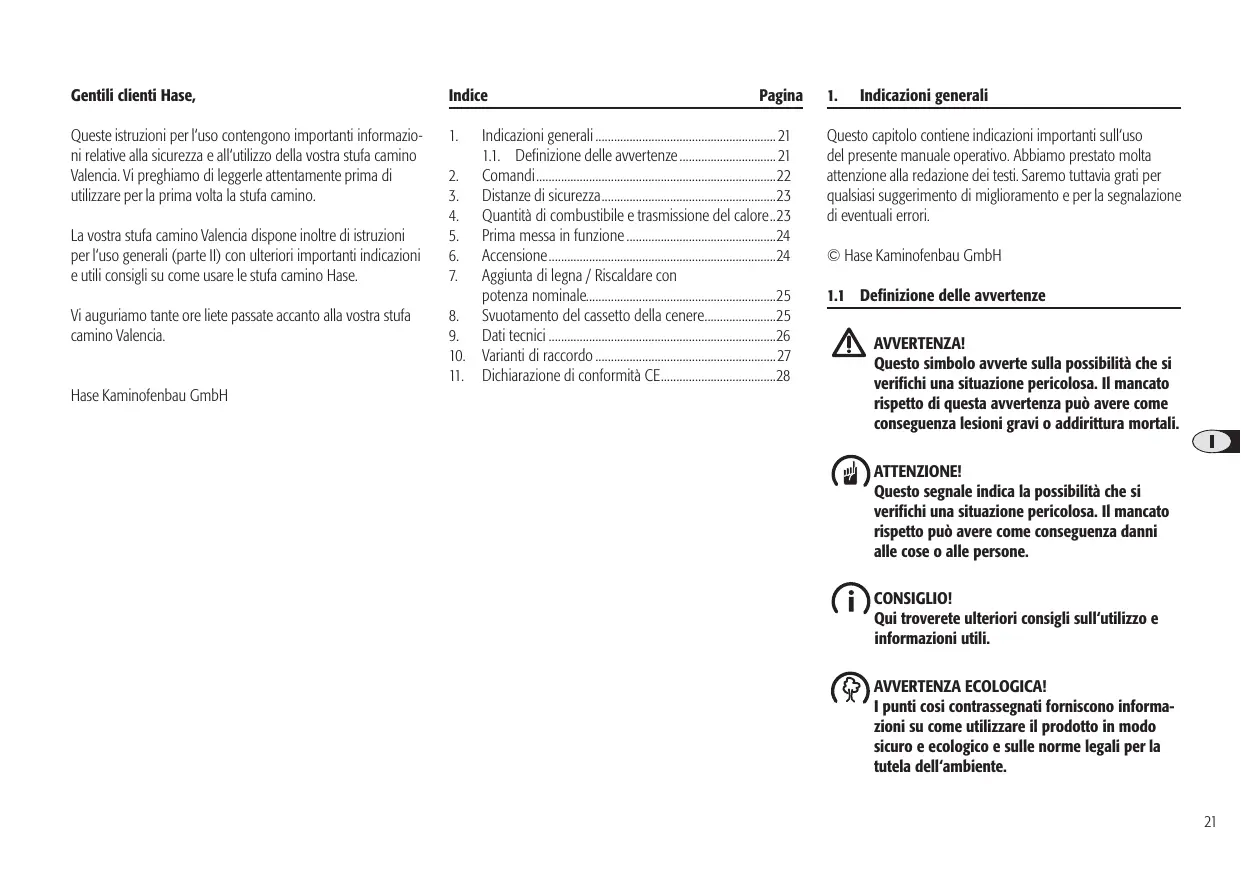 Questo capitolo contiene indicazioni importanti sull‘uso del presente manuale operativo. Abbiamo prestato molta attenzione alla redazione dei testi. Saremo tuttavia grati per qualsiasi suggerimento di miglioramento e per la segnalazione di eventuali errori. © Hase Kaminofenbau GmbH 1.1 Definizione delle avvertenze AVVERTENZA! Questo simbolo avverte sulla possibilità che si verifichi una situazione pericolosa. Il mancato rispetto di questa avvertenza può avere come conseguenza lesioni gravi o addirittura mortali. ATTENZIONE! Questo segnale indica la possibilità che si verifichi una situazione pericolosa. Il mancato rispetto può avere come conseguenza danni alle cose o alle persone. CONSIGLIO! Qui troverete ulteriori consigli sull‘utilizzo e informazioni utili. AVVERTENZA ECOLOGICA! I punti cosi contrassegnati forniscono informazioni su come utilizzare il prodotto in modo sicuro e ecologico e sulle norme legali per la tutela dell‘ambiente. 21