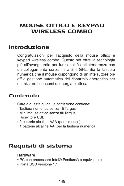 MANUALE UTENTE WIRELESS KEYPAD AND OPTICAL MOUSE COMBO TARGUS