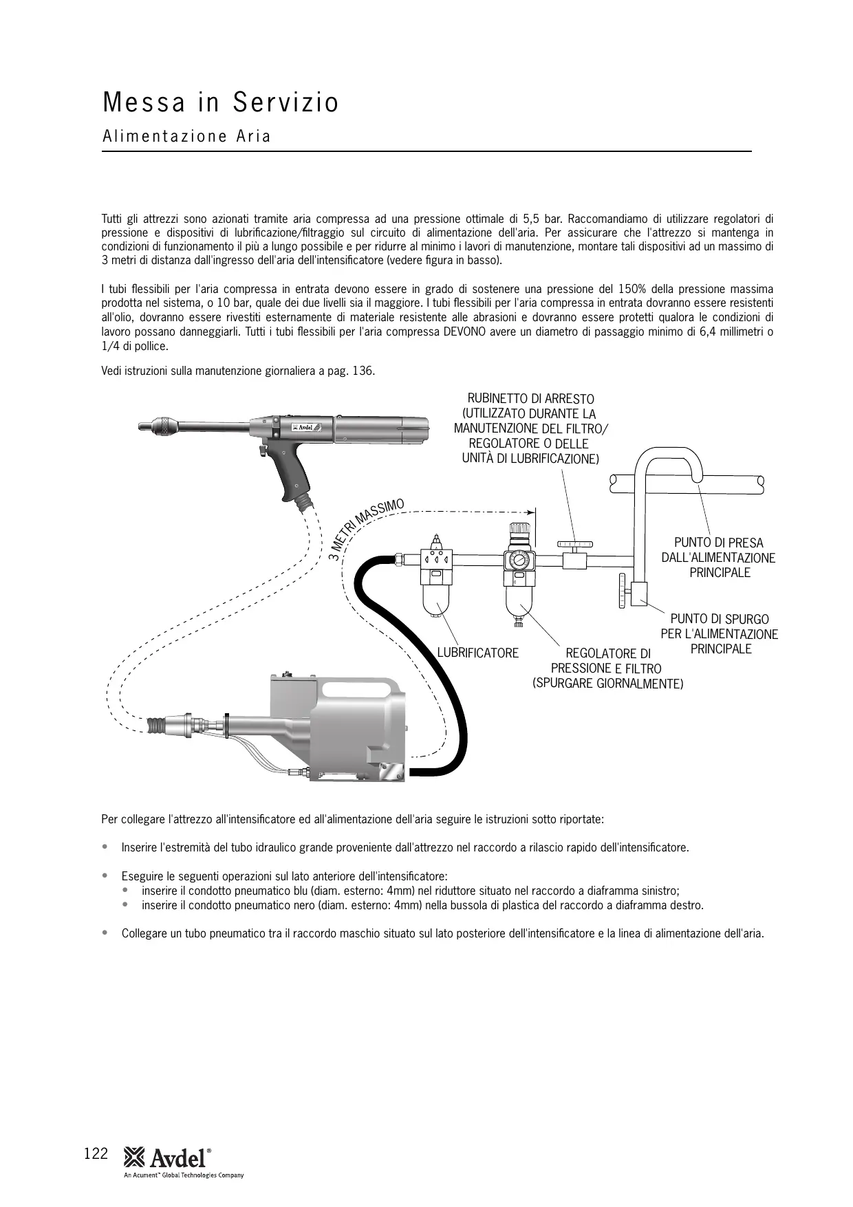 Messa in Servizio Alimentazione Aria Tutti gli attrezzi sono azionati tramite aria compressa ad una pressione ottimale di 5,5 bar. Raccomandiamo di utilizzare regolatori di pressione e dispositivi di lubrificazione/filtraggio sul circuito di alimentazione dell'aria. Per assicurare che l'attrezzo si mantenga in condizioni di funzionamento il più a lungo possibile e per ridurre al minimo i lavori di manutenzione, montare tali dispositivi ad un massimo di 3 metri di distanza dall'ingresso dell'aria dell'intensificatore (vedere figura in basso). I tubi flessibili per l'aria compressa in entrata devono essere in grado di sostenere una pressione del 150% della pressione massima prodotta nel sistema, o 10 bar, quale dei due livelli sia il maggiore. I tubi flessibili per l'aria compressa in entrata dovranno essere resistenti all'olio, dovranno essere rivestiti esternamente di materiale resistente alle abrasioni e dovranno essere protetti qualora le condizioni di lavoro possano danneggiarli. Tutti i tubi flessibili per l'aria compressa DEVONO avere un diametro di passaggio minimo di 6,4 millimetri o 1/4 di pollice. Vedi istruzioni sulla manutenzione giornaliera a pag. 136.