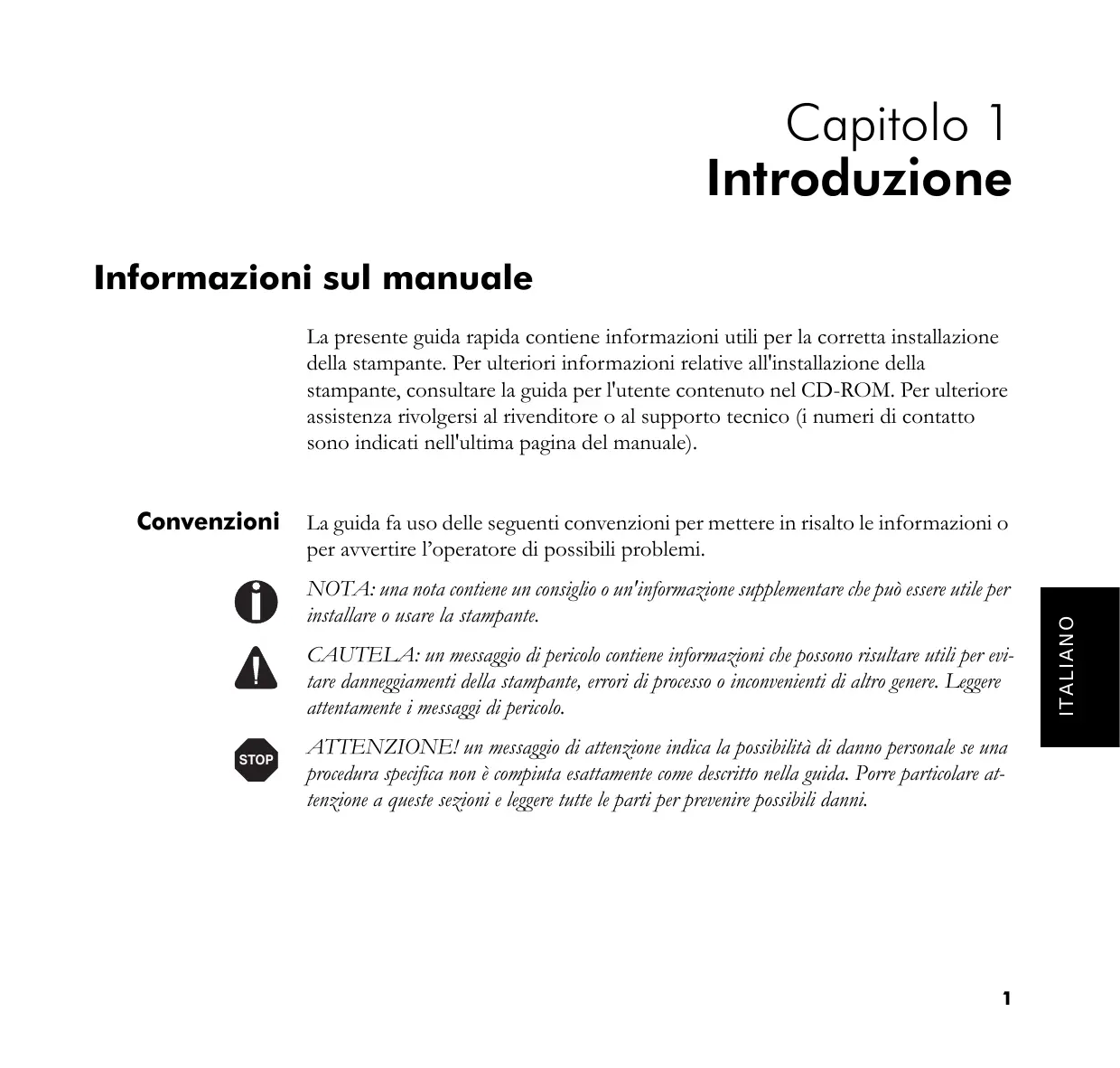 La presente guida rapida contiene informazioni utili per la corretta installazione della stampante. Per ulteriori informazioni relative all'installazione della stampante, consultare la guida per l'utente contenuto nel CD-ROM. Per ulteriore assistenza rivolgersi al rivenditore o al supporto tecnico (i numeri di contatto sono indicati nell'ultima pagina del manuale). La guida fa uso delle seguenti convenzioni per mettere in risalto le informazioni o per avvertire l’operatore di possibili problemi. NOTA: una nota contiene un consiglio o un'informazione supplementare che puÿ essere utile per installare o usare la stampante. CAUTELA: un messaggio di pericolo contiene informaziont che possono risultare utili per evi- lare danneggiamenti della stambante, errori di processo o inconvenienti di altro genere. Leggere attentamente i messaggi di pericolo. ATTENZIONE! un messaggio di attenzione indica la possibilità di danno personale se una brocedura specifica non è compinta esattamente come descritto nella guida. Porre particolare at- tenzione a queste sezioni e leggere tutte le parti per prevenire possibili danni.