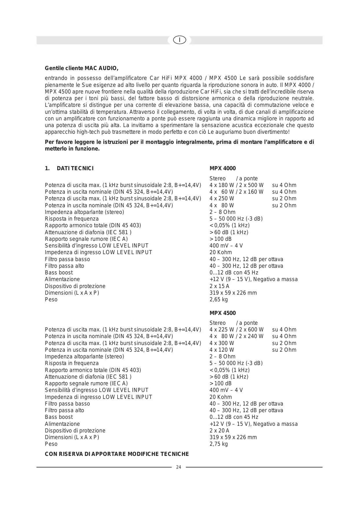 Gentile cliente MAC AUDIO, entrando in possesso dell’amplificatore Car HiFi MPX 4000 / MPX 4500 Le sarà possibile soddisfare pienamente le Sue esigenze ad alto livello per quanto riguarda la riproduzione sonora in auto. Il MPX 4000 / MPX 4500 apre nuove frontiere nella qualità della riproduzione Car HiFi, sia che si tratti dell’incredibile riserva di potenza per i toni più bassi, del fattore basso di distorsione armonica o della riproduzione neutrale. L’amplificatore si distingue per una corrente di elevazione bassa, una capacità di commutazione veloce e un’ottima stabilità di temperatura. Attraverso il collegamento, di volta in volta, di due canali di amplificazione con un amplificatore con funzionamento a ponte può essere raggiunta una dinamica migliore in rapporto ad una potenza di uscita più alta. La invitiamo a sperimentare la sensazione acustica eccezionale che questo apparecchio high-tech può trasmettere in modo perfetto e con ciò Le auguriamo buon divertimento! Per favore leggere le istruzioni per il montaggio integralmente, prima di montare l’amplificatore e di metterlo in funzione.
