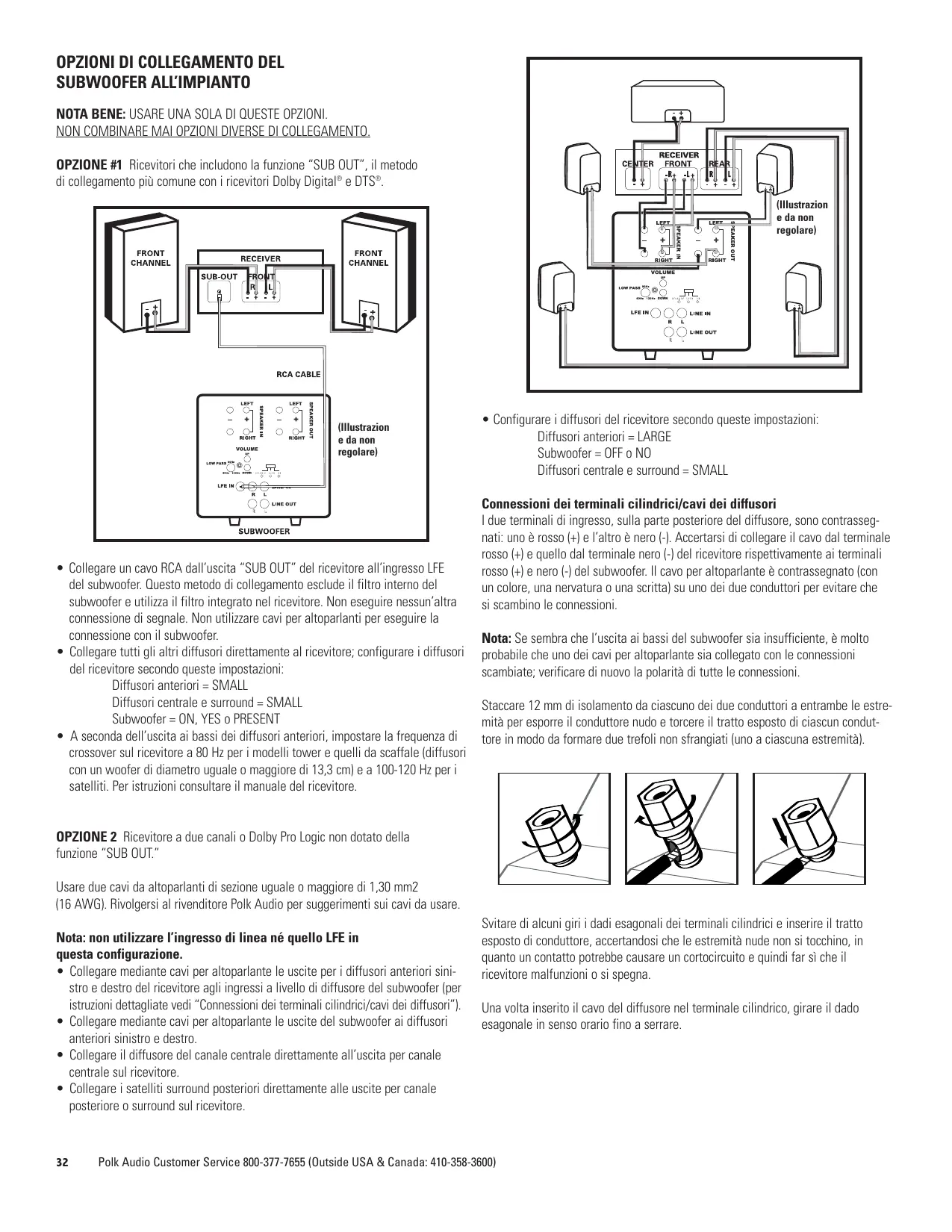 Usare due cavi da altoparlanti di sezione uguale o maggiore di 1,30 mm2 (16 AWG). Rivolgersi al rivenditore Polk Audio per suggerimenti sui cavi da usare.