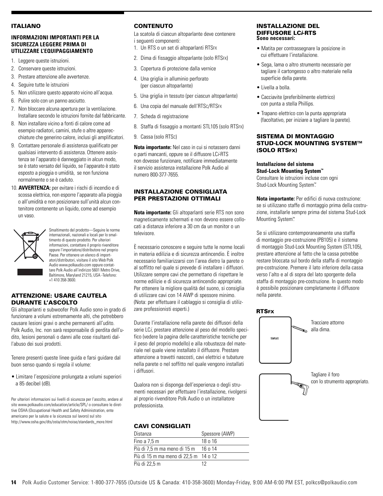 Nota importante: Gli altoparlanti serie RTS non sono magneticamente schermati e non devono essere collocati a distanza inferiore a 30 cm da un monitor o un televisore. È necessario conoscere e seguire tutte le norme locali in materia edilizia e di sicurezza antincendio. È inoltre necessario familiarizzarsi con l’area dietro la parete o al soffitto nel quale si prevede di installare i diffusori. Utilizzare sempre cavi che permettano di rispettare le norme edilizie e di sicurezza antincendio appropriate. Per ottenere la migliore qualità del suono, si consiglia di utilizzare cavi con 14 AWP di spessore minimo. (Nota: per effettuare il cablaggio si consiglia di utilizzare professionisti esperti.) Durante l’installazione nella parete dei diffusori della serie LCi, prestare attenzione al peso del modello specifico (vedere la pagina delle caratteristiche tecniche per il peso del proprio modello) e alla robustezza del materiale nel quale viene installato il diffusore. Prestare attenzione a travetti nascosti, cavi elettrici e tubature nella parete o nel soffitto nel quale vengono installati i diffusori. Qualora non si disponga dell’esperienza o degli strumenti necessari per effettuare l’installazione, rivolgersi al proprio rivenditore Polk Audio o un installatore professionista. CAVI CONSIGLIATI Distanza Fino a 7,5 m Più di 7,5 m ma meno di 15 m Più di 15 m ma meno di 22,5 m Più di 22,5 m INSTALLAZIONE DEL DIFFUSORE LCi-RTS Sono necessari: