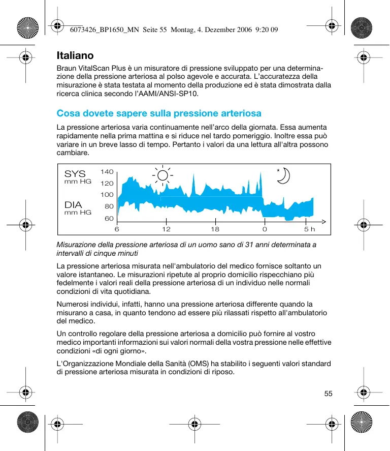 6073426_BP1650_MN Seite 55 Montag, 4. Dezember 2006 9:20 09 Italiano Braun VitalScan Plus è un misuratore di pressione sviluppato per una determinazione della pressione arteriosa al polso agevole e accurata. L’accuratezza della misurazione è stata testata al momento della produzione ed è stata dimostrata dalla ricerca clinica secondo l’AAMI/ANSI-SP10. Cosa dovete sapere sulla pressione arteriosa La pressione arteriosa varia continuamente nell’arco della giornata. Essa aumenta rapidamente nella prima mattina e si riduce nel tardo pomeriggio. Inoltre essa può variare in un breve lasso di tempo. Pertanto i valori da una lettura all'altra possono cambiare. SYS