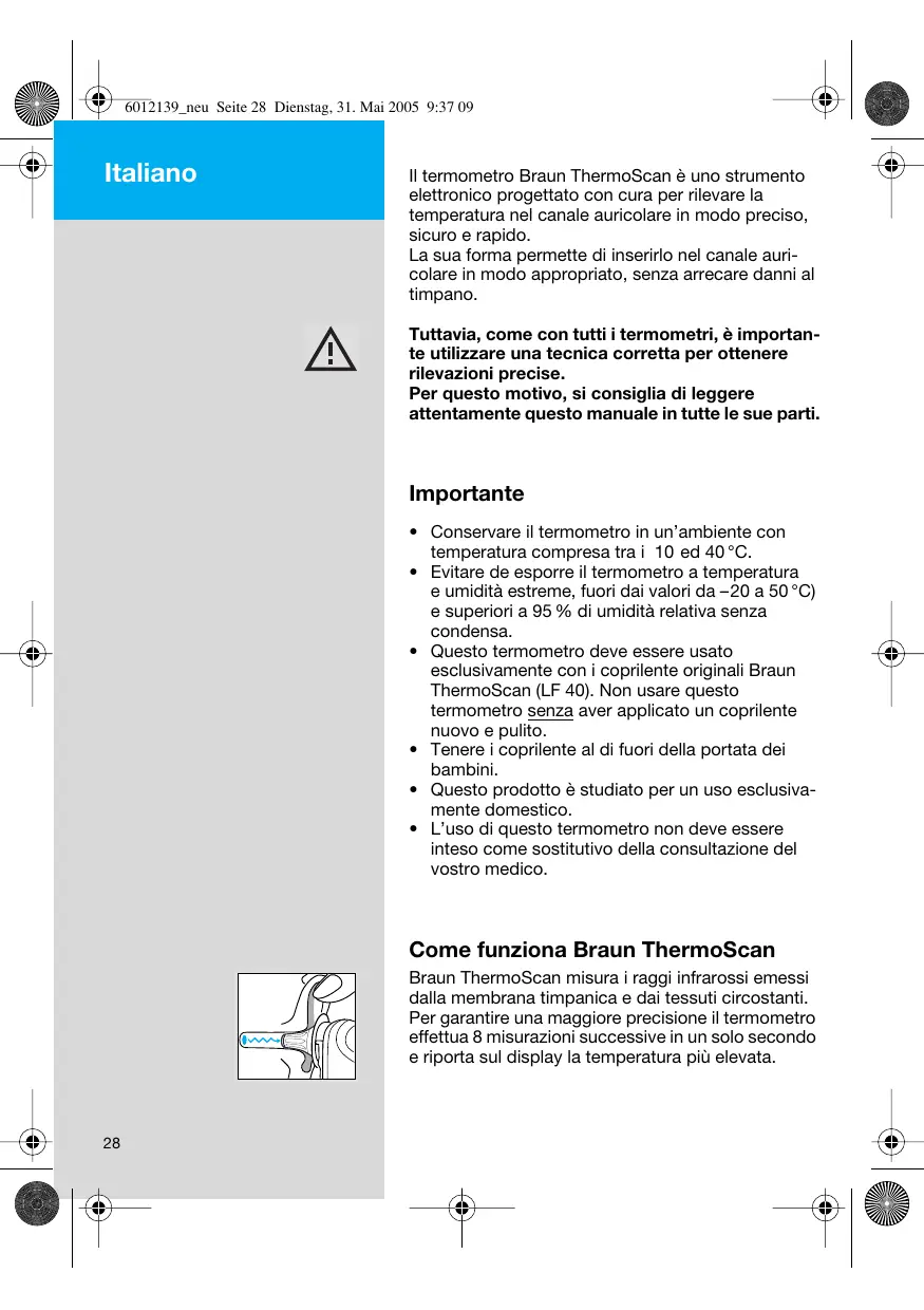 6012139_neu Seite 28 Dienstag, 31. Mai 2005 9:37 09 Italiano Il termometro Braun ThermoScan è uno strumento elettronico progettato con cura per rilevare la temperatura nel canale auricolare in modo preciso, sicuro e rapido. La sua forma permette di inserirlo nel canale auricolare in modo appropriato, senza arrecare danni al timpano. Tuttavia, come con tutti i termometri, è importante utilizzare una tecnica corretta per ottenere rilevazioni precise. Per questo motivo, si consiglia di leggere attentamente questo manuale in tutte le sue parti. Importante