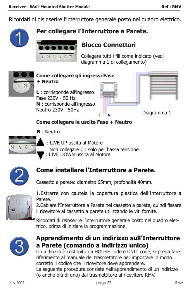 2.Cablare l'Interruttore a Parete nel cassetto a parete, quando fissare il ricevitatore al cassetto a parete'utilizzando le viti fornite.