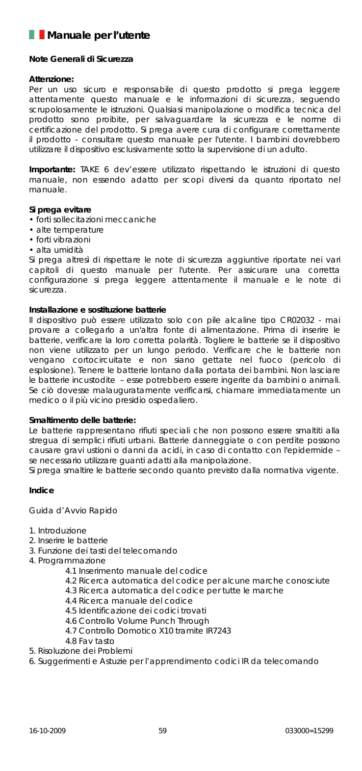 Importante: TAKE 6 dev'essere utilizzato rispettoando le istruzioni di quello manuale, non essendo adatto per scopi diversi da quando riportato nel manuale.