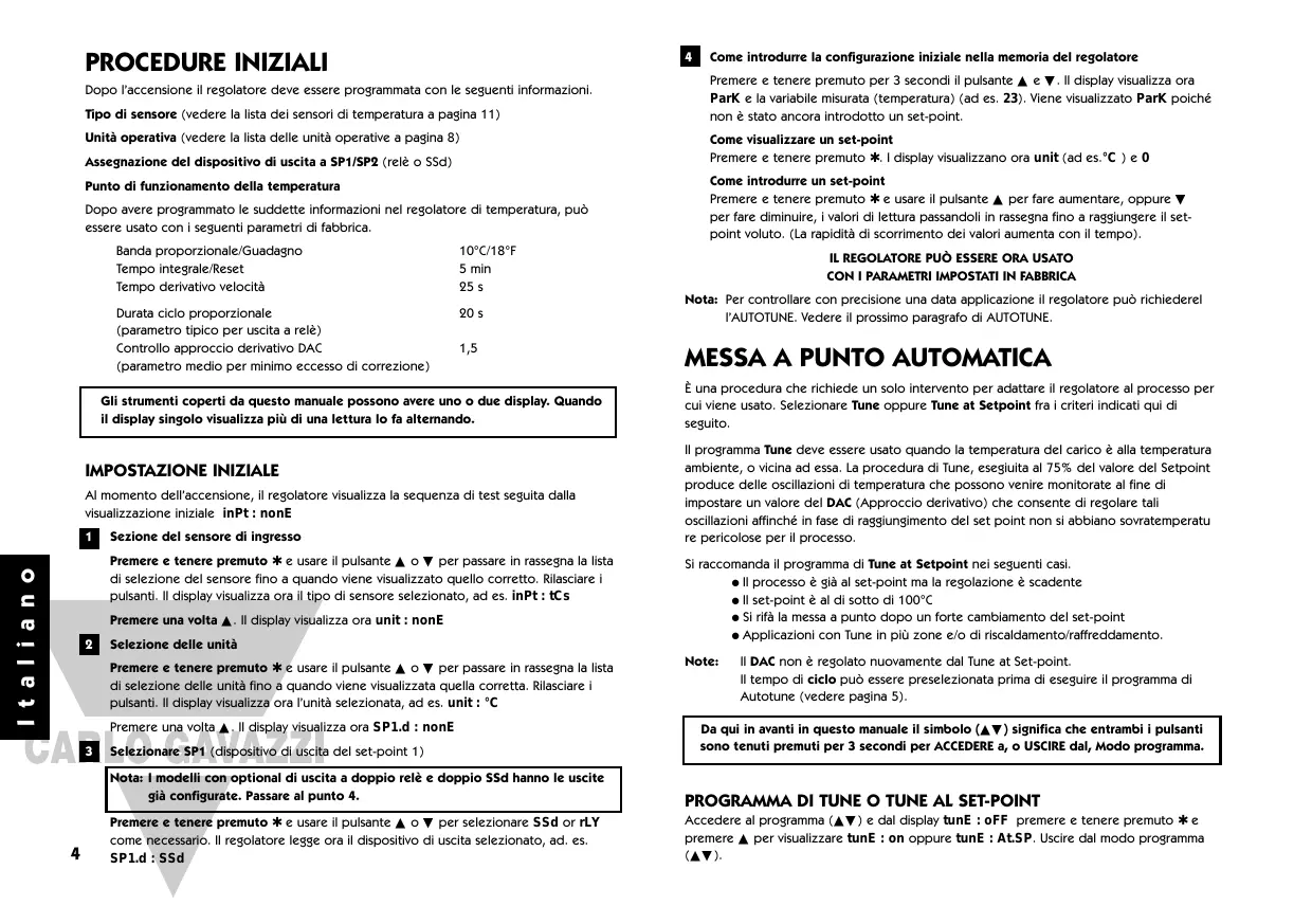 Da SPrr nel Livello 1, premere e tenere premuto ✱ e ▲ o ▼ per passare in rassegna e raggiungere la pendenza della rampa desiderata. Da SoAk – – nel Livello 1, premere e tenere premuto ✱ e ▲ o ▼ per passare in rassegna e raggiungere il tempo di stasi desiderato. Impostare Rampa accesa (Spenta; Accesa; Mantenuta) Da Sprn nel Livello 1, premere e tenere premuto ✱, poi premere ▲ per selezionare On (Acceso). Uscire dal programma (▲▼) per introdurre i parametri nella memoria e cominciare la rampa verso il punto di set-point. Note: I t a l i a n o Come preselezionare l’Accettazione Automatica del tempo di durata calcolato dall’ AUTOTUNE Prima che inizi l’AUTOTUNE, selezionareCYC.t nel Livello 1; premere e tenere premuto il pulsante ✱ e ▼ fino a quando l’avanzamento si ferma su A – –. Uscire dal programma (▲▼) per accettare automaticamente il valore calcolato. Tempo Nella configurazione Rampa accesa, se l’alimentazione del regolatore viene spenta la rampa ricomincia quando è riaccesa. L’opzione Rampa mantenuta sospende la rampa al suo ultimo valore. Se non è stato impostato alcun periodo di stasi, il controllo al set-point bersaglio continua indefinitamente. Gli allarmi di deviazione di SP2 seguono il punto di funzionamento della rampa e possono essere usati per produrre l’allarme di pendenza “fuori dei limiti” della rampa. AVVERTENZA Quando il punto di funzionamento della rampa raggiunge il set-point, il timer di stasi è attivato. Se la pendenza della rampa è impostata su una valore troppo alto per il processo, il timer di stasi viene innescato prima che la temperatura del processo raggiunga set-point.