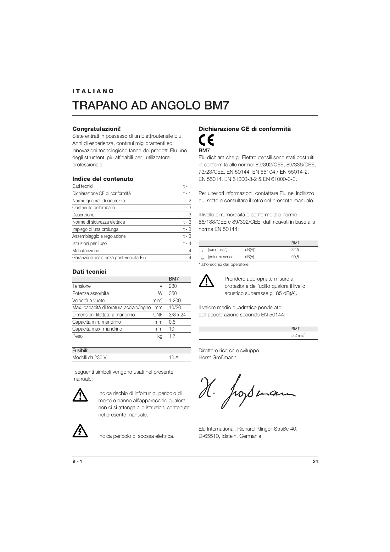 Il livello di rumorosità è conforme alle norme 86/188/CEE e 89/392/CEE, dati ricavati in base alla norma EN 50144: BM7 EN 61000-3-3. Neem voor meer informatie contact op met Elu, zie het adres hieronder of op de achterkant van deze handleiding. Niveau van de geluidsdruk overeenkomstig 86/188/EEG & 89/392/EEG, gemeten volgens EN 50144: BM7