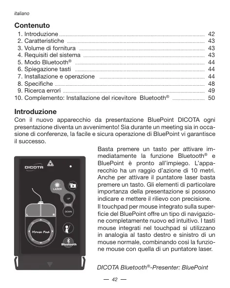 Scarica le istruzioni per il tuo Telecomando in formato PDF gratuitamente! Trova il tuo manuale BLUEPOINT - DICOTA e riprendi in mano il tuo dispositivo elettronico. In questa pagina sono pubblicati tutti i documenti necessari per l'utilizzo del tuo dispositivo. BLUEPOINT del marchio DICOTA.