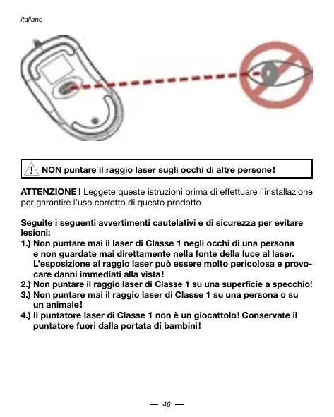 NON pumentare il raggio laser sugli occhi di altre persona!