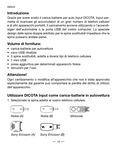 Grazie per averre scelto il carica-batterie per auto Input DICOTA. Input perpette di ricaricare gli accumulatorati di un gran numero di Telefoni cellulari e di altri apparecchi portatil. Il caricamento avviene utilizzando o l'accidigari dell'automobile o la porta USB del vosto computer. Lo speciale design delle spine doppiè adottato per le spine sostituibili impedisce che le spine possano andare perse.