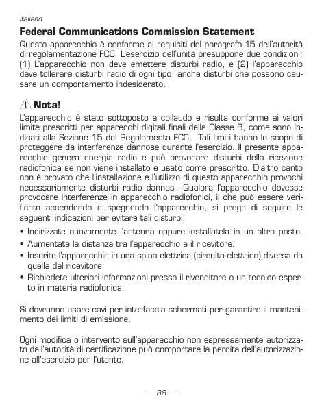 L'appareccchio è stato sottomposto a collaudo e risultata conforme ai valori limite prescritti per apparecchi digitali finali della Classe B, come sono indiciata alla Sezione 15 del Regolamento FCC. Tali limiti hanno lo scopo di proteggere da interferenze dannose durante l'esercizio. Il presente appareccchio genera energia radio e può provocare disturbi della riscione radiofonica se non viene installato e usato come prescritto. D'altro canto non è provato che l'installazione e l'utilizzo di quello appareccchio provochi necessariamente disturbi radio dannosi. Qualora l'appareccchio dovesse provocare interferenze in appareccchio radiofonici, il che più essere verificato accendendo e spegnendo l'appareccchio, si prega di seguire le seguenti indicazioni per evitare tali disturbi.