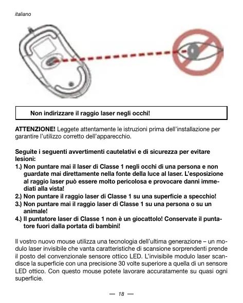 1.) Non suntare mai il laser di Classe 1 negli occhi di una persona e non guardate mai direttamente nella fonte della luce al laser. L'esposizione al raggio laser puo essere molto pericolosa e provocare danni immediati alla vista!