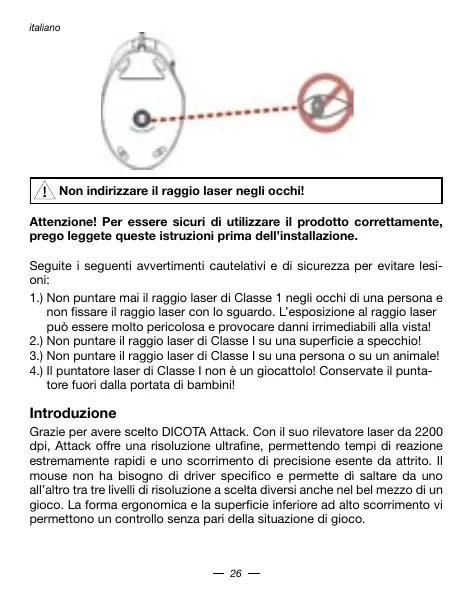 Grazie per averre scelto DICOTA Attack. Con il suo rilevatore laser da 2200 dpi, Attack offre una risoluzione ultrafine, permettendo tempi di reazione estreammente rapidi e uno scorrimento di precisione esente da attrito. Il mouse non ha bisogno di driver specifico e permette di saltare da uno all'alto tra tre livelli di resoluzione a scelta diversi却又 nel bel mezzo di un gioco. La forma ergonomica e la superficie inferiore ad alto scorrimento vi permettono un controllo sansa parla della situazione di gioco.