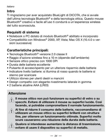 Ti ringraziamo per aver acquistato BlueLight di DICOTA, che si avvale dell'ultima Tecnologia Bluetooth® e della Tecnologia ottica. Questo mouse Bluetooth® creativo e facile all'uso ti condurrà a un'esperienza wireless del tutto sconosciuti.